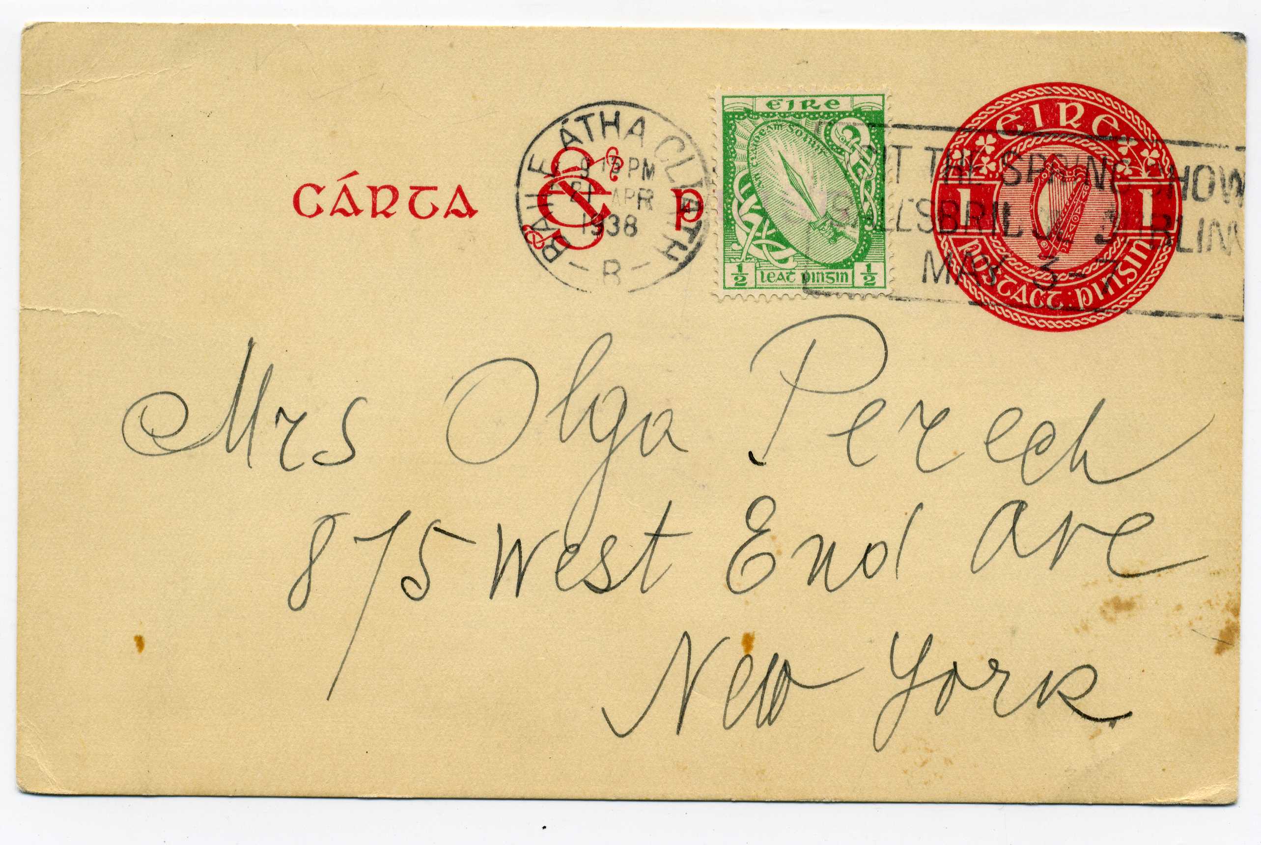PH059 Image | 1938 Postal Stationery 1d Postcard used to New York with additional ½d adhesive and tied by Dublin "Visit the Spring Show" slogan cancel.