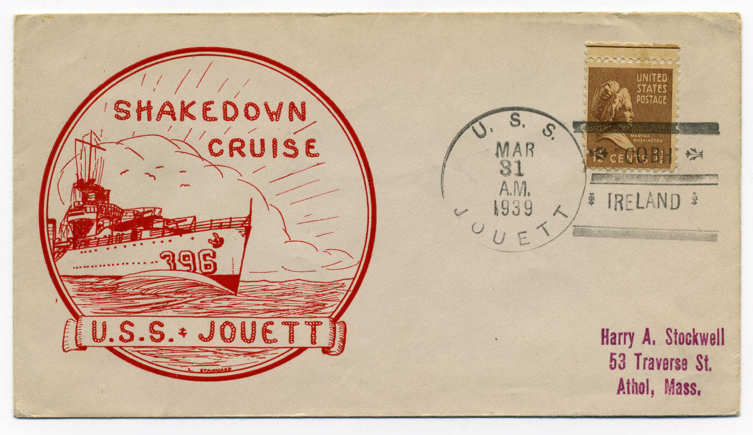 PH060.05 Image | 1939 Shakedown Cruise USS Jouett souvenir cover bearing US adhesive tied USS Jouett Cobh Ireland cancel, unusual