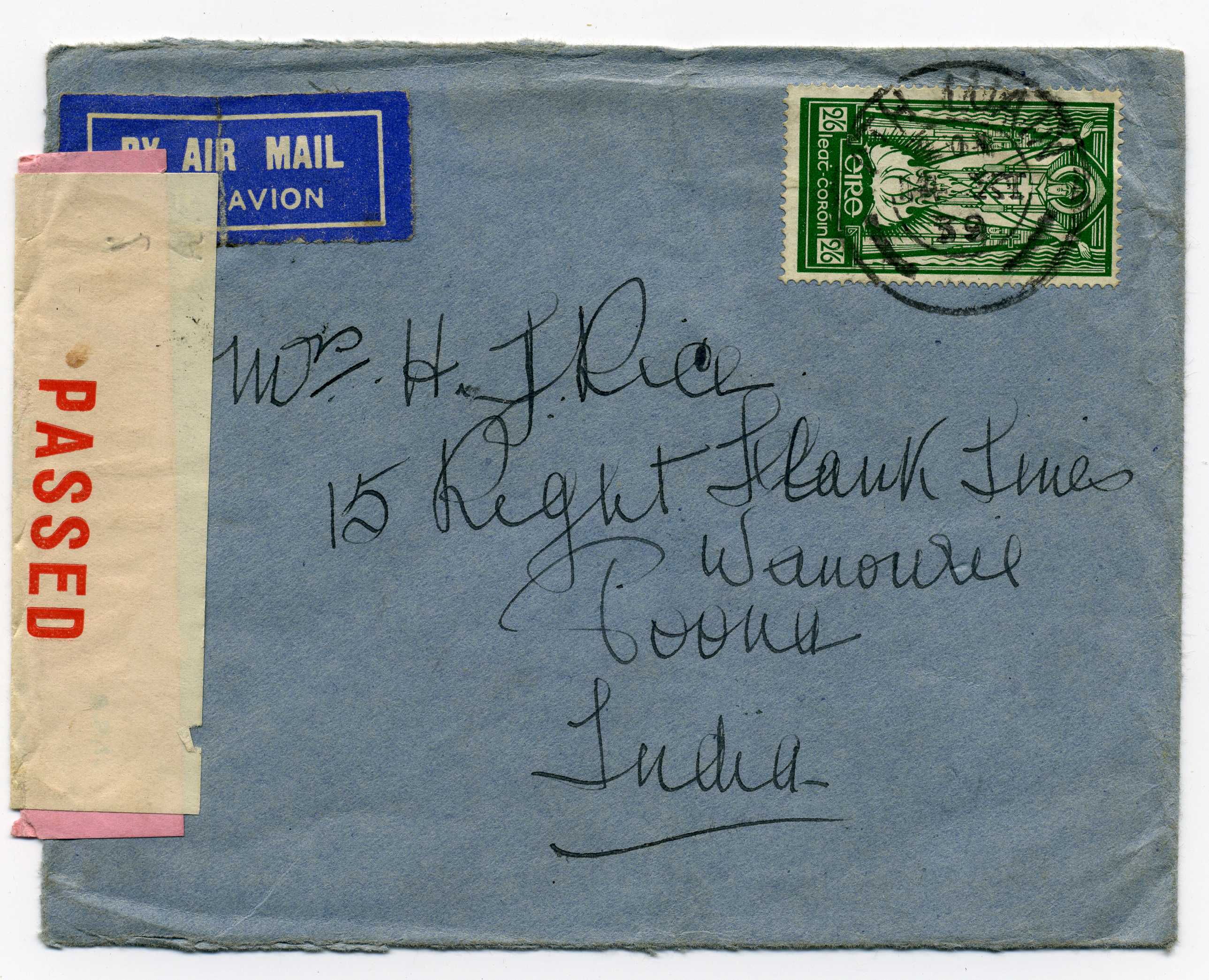 PH060.09 Image | 1939 Air Mail cover to India bearing SE 2-6d value tied by Athlone cds and with both Irish and Indian censor labels