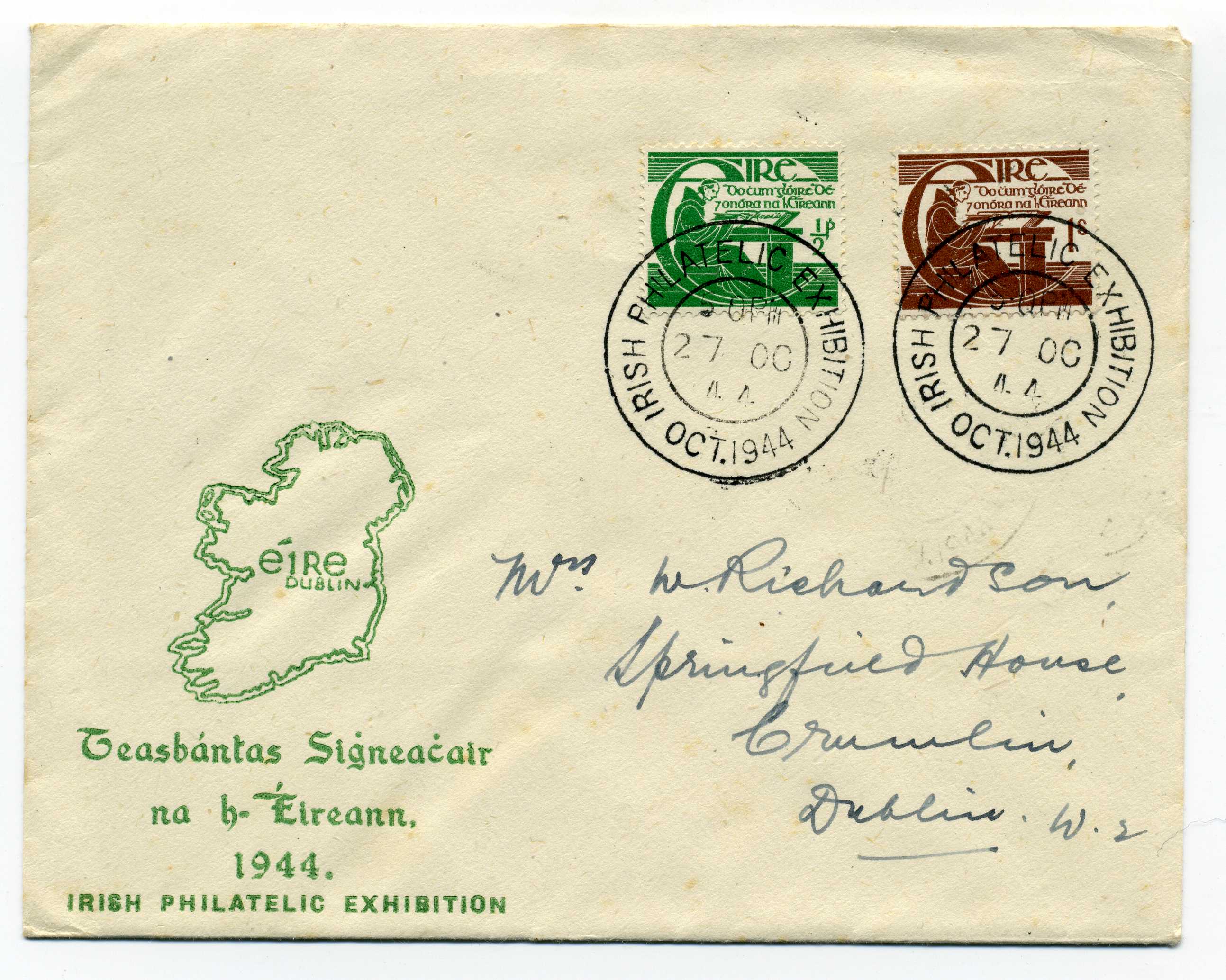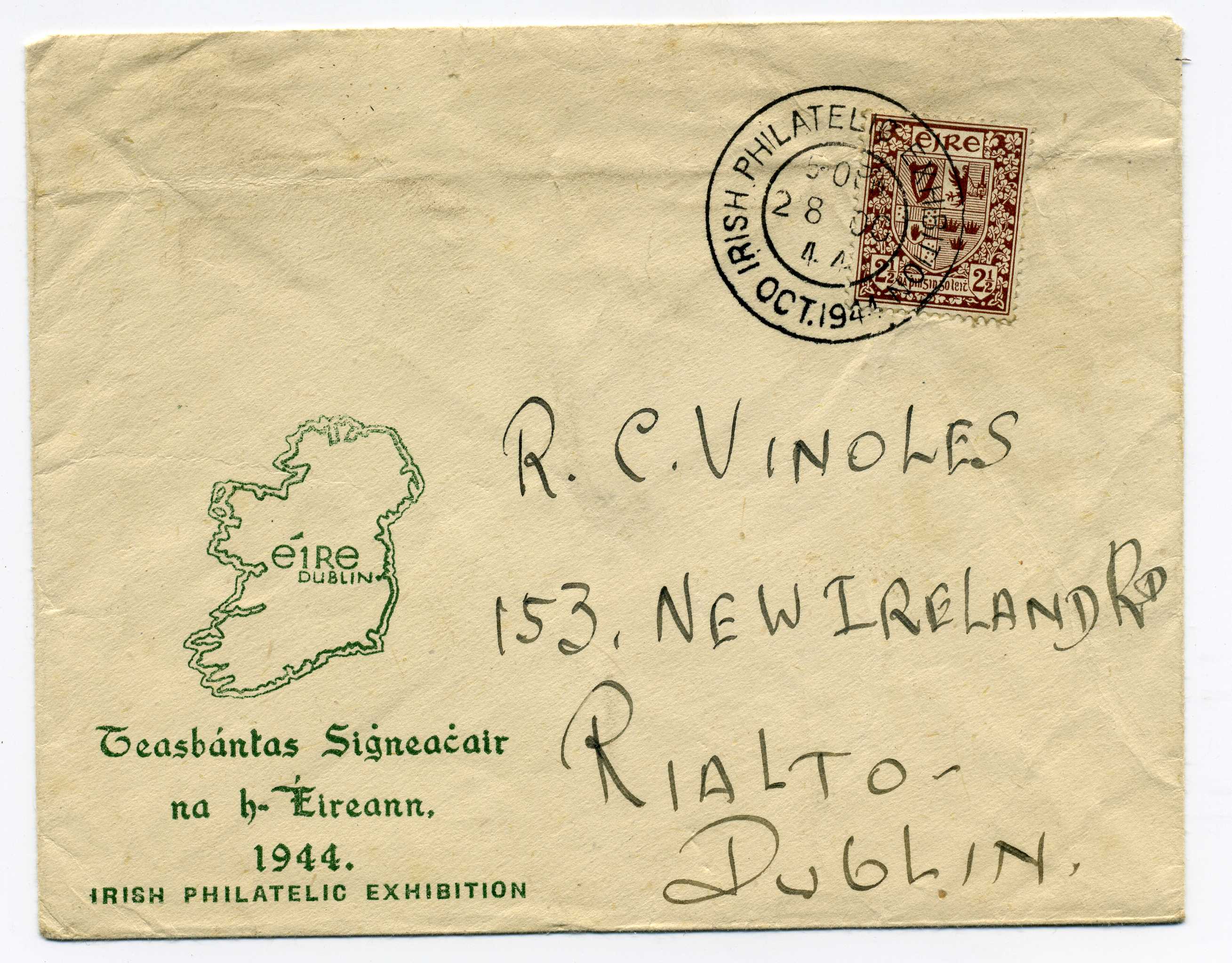 PH060.3 Image | 1944 Irish Philatelic Exhibition illustrated cover bearing O Clery set tied by 2 strikes of exhibition souvenir cancel