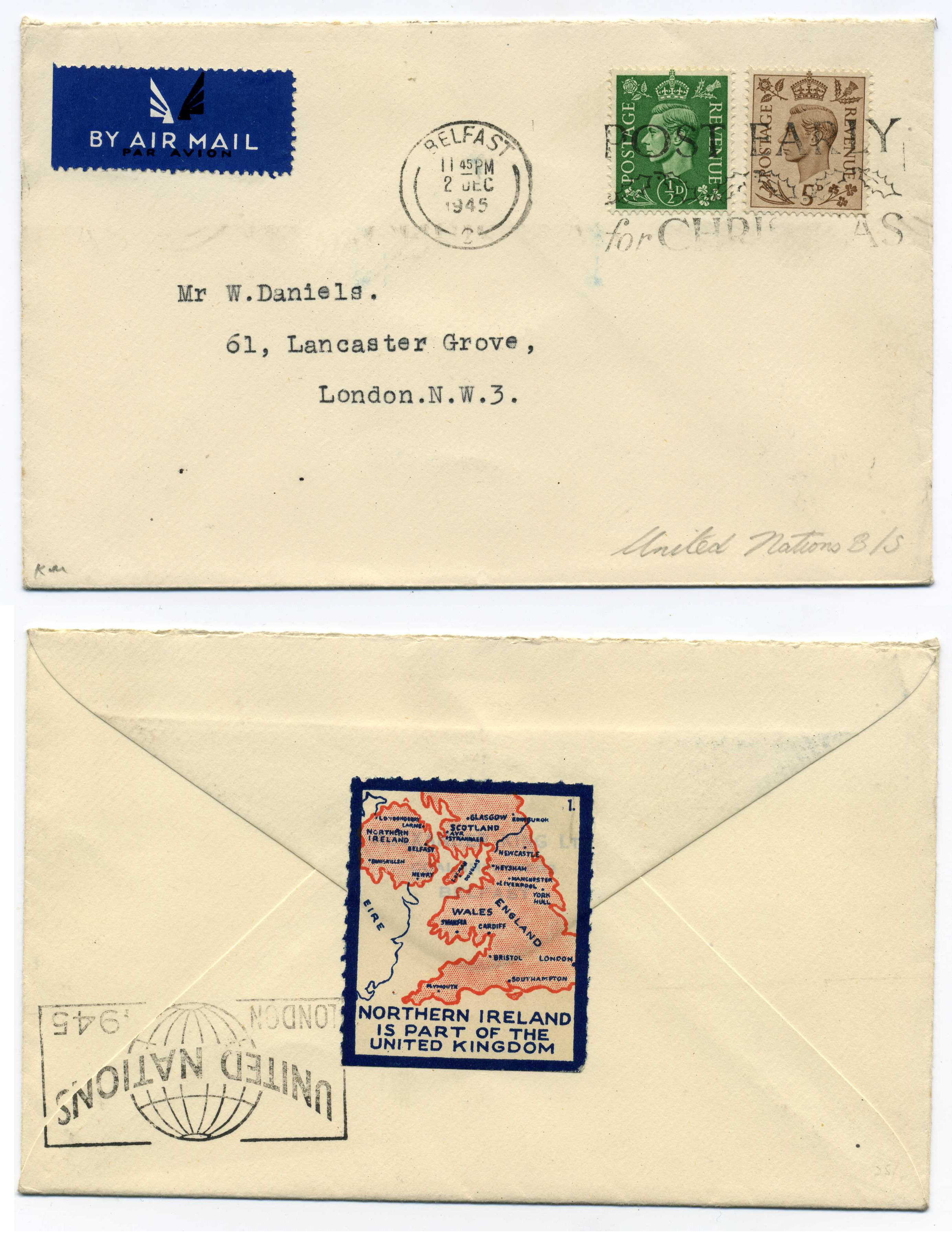 PH060.75 Image | 1945 Cover from Belfast to London with label on reverse "Northern Ireland is part of the United Kingdom" just tied by slogan backstamp.