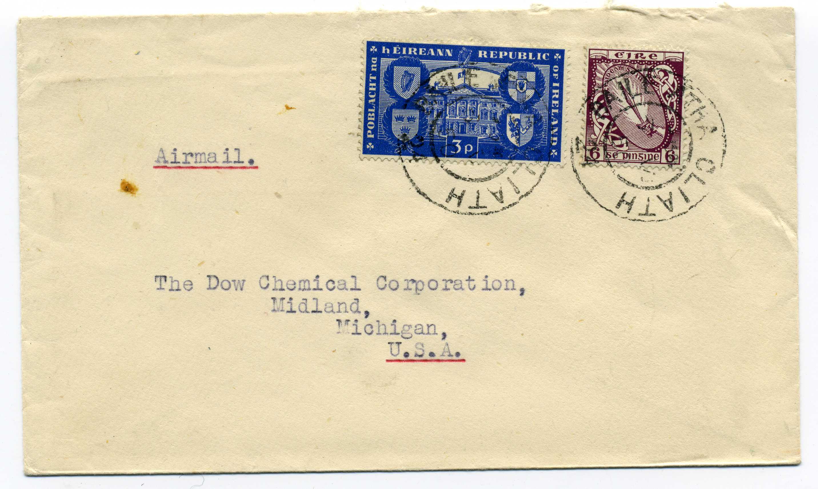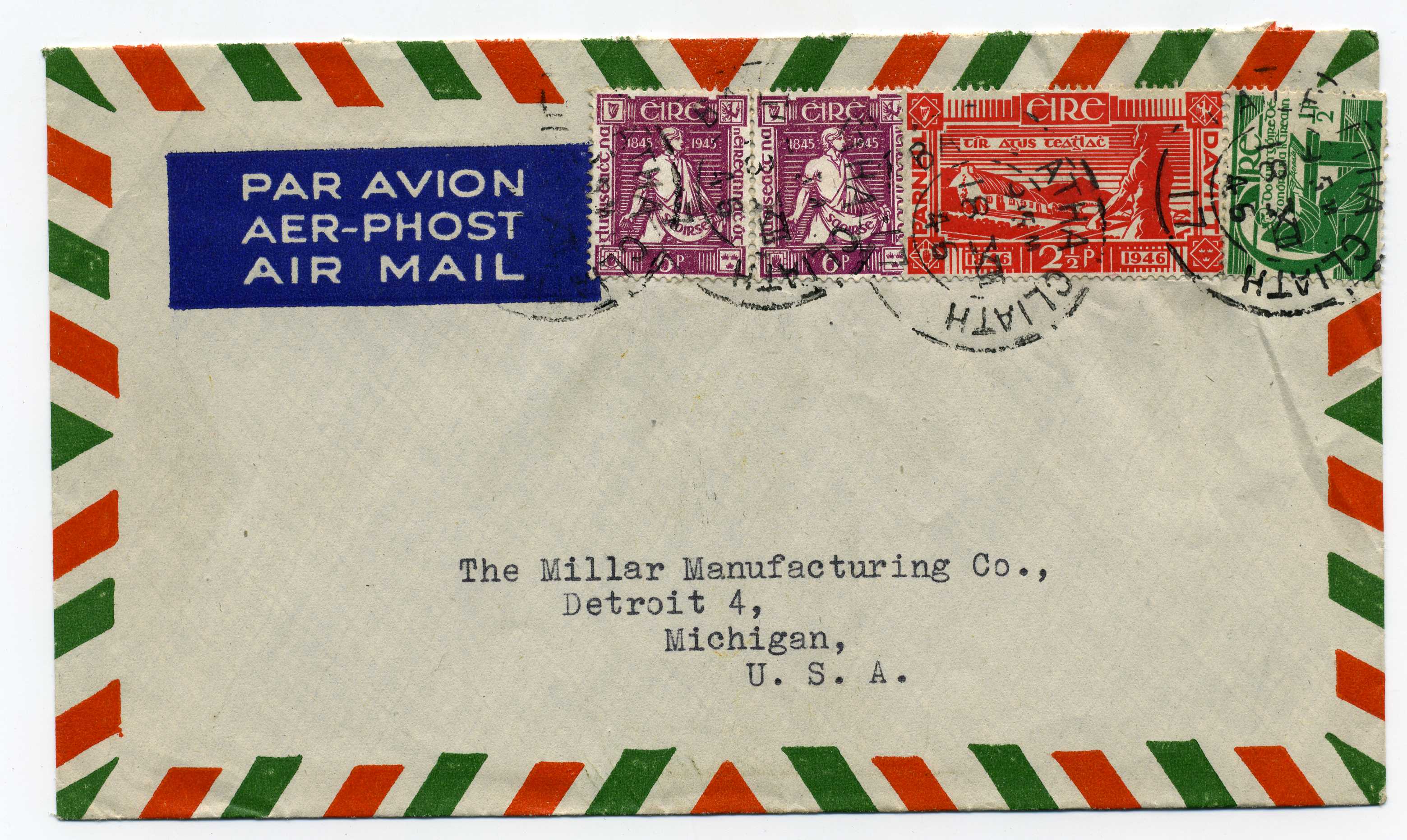 PH060.85 Image | 1946 Airmail cover to USA with Davis 6d (2) Davitt 2½d and O Clery ½ all tied by Baile Atha Cliath cds