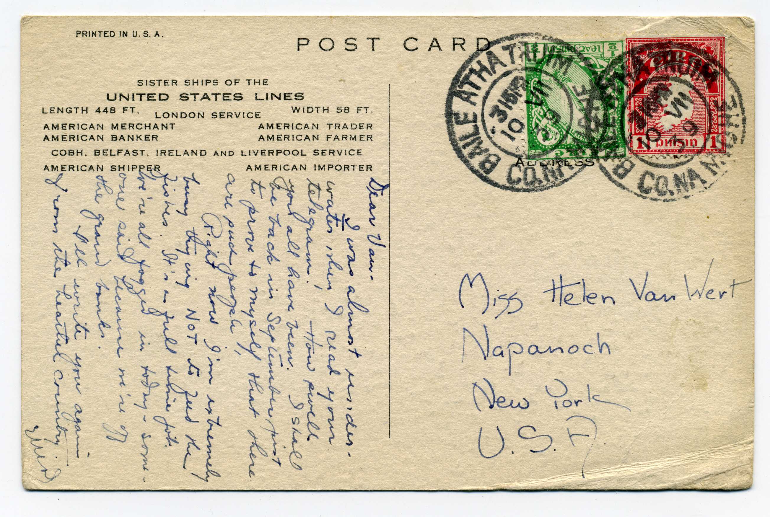 PH060 Image | 1939 United States Line illustrated Postcard bearing ½d and 1d adhesives tied by exceptional strike "Baile Atha Truim" 10/7/39.