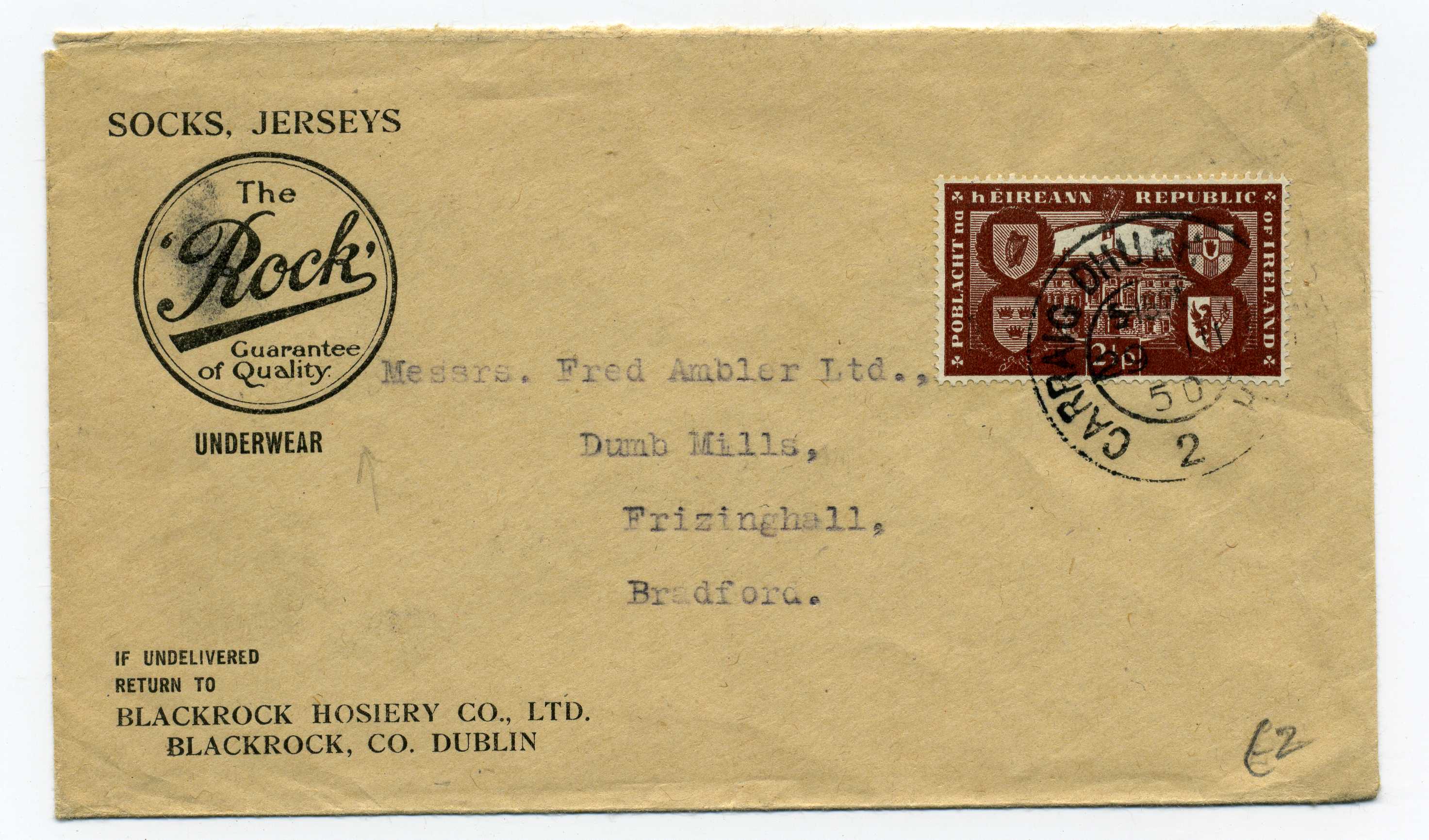 PH064 Image | 1950 Advertising Cover "Blackrock Hosiery Co. Ltd." bearing Republic 2½d tied by cds