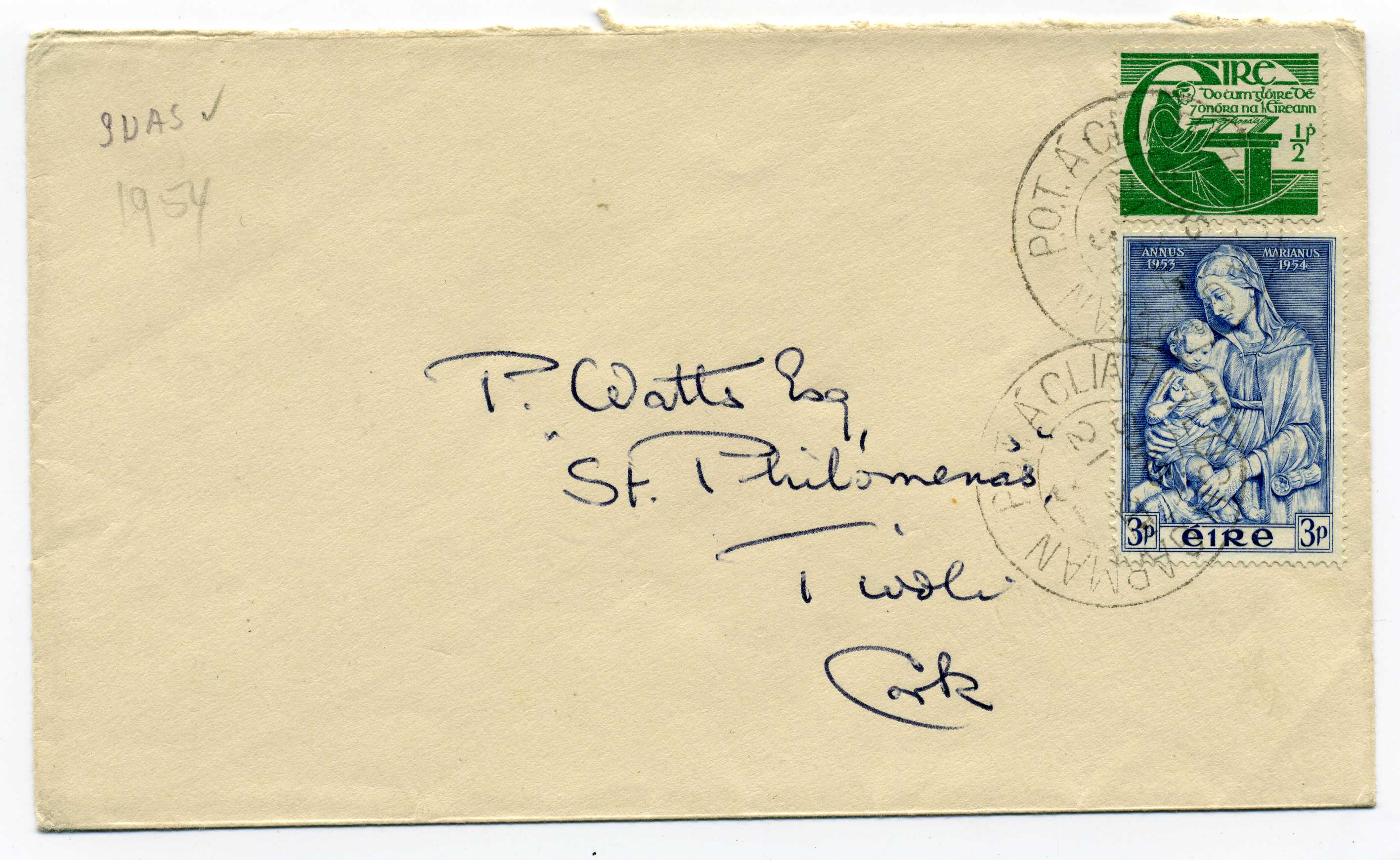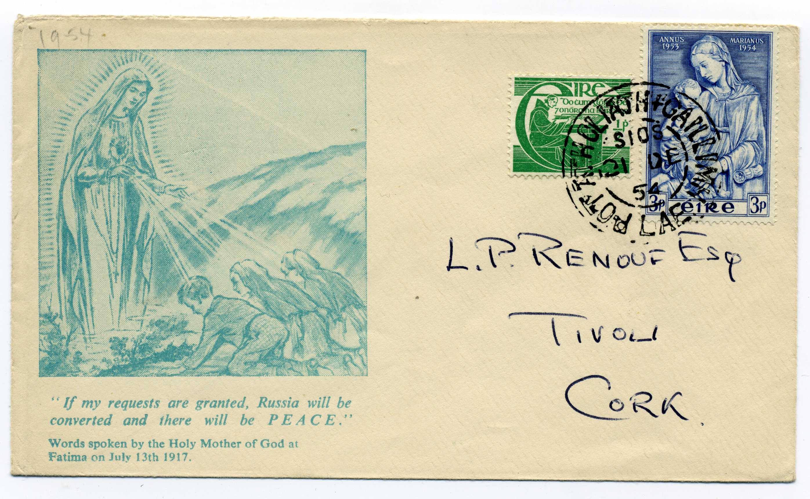PH072 Image | 1954 Marian Year Souvenir Cover with 3d and ½d adhesives tied by Dublin & Galway TPO Day Down 21/12/54.