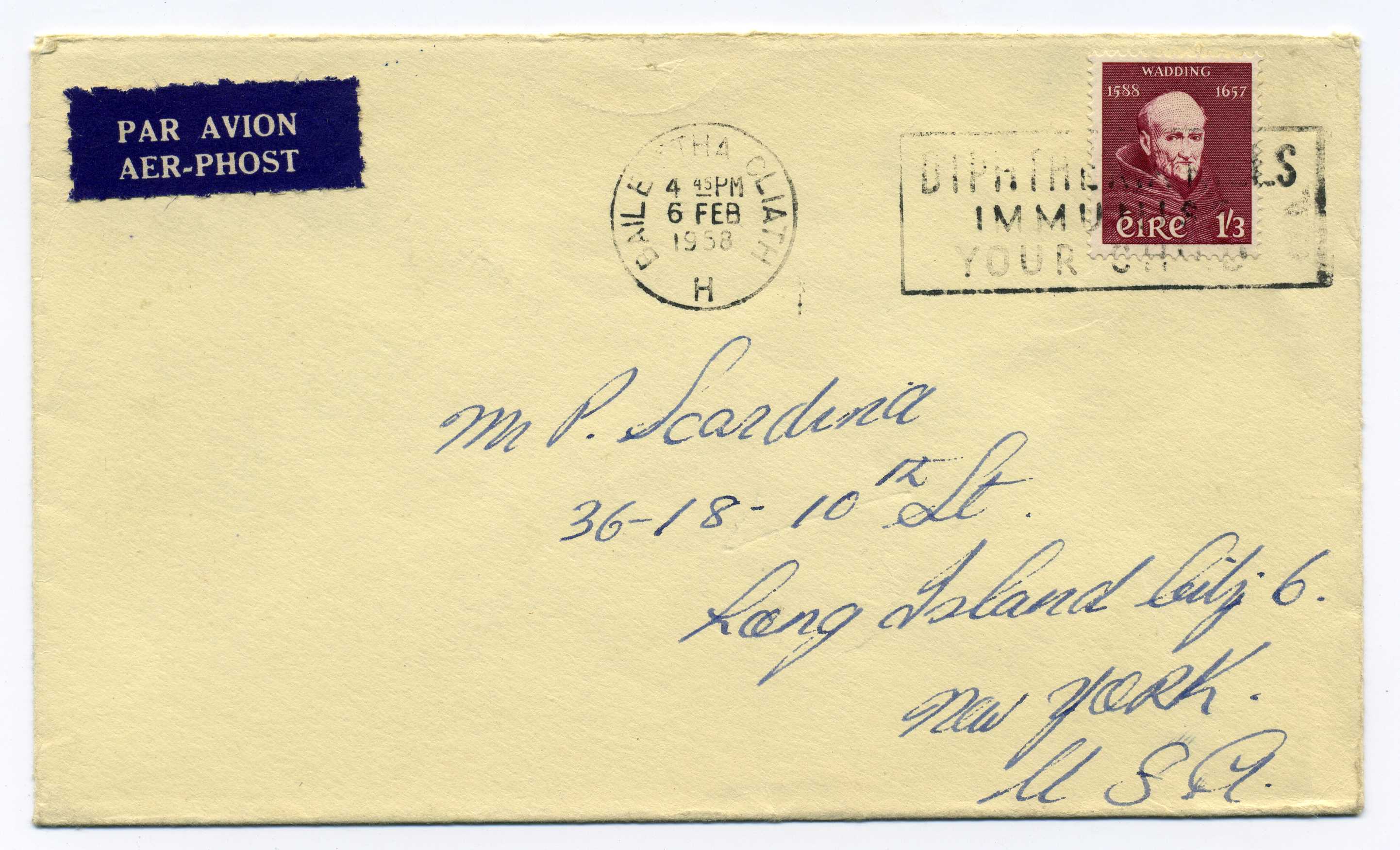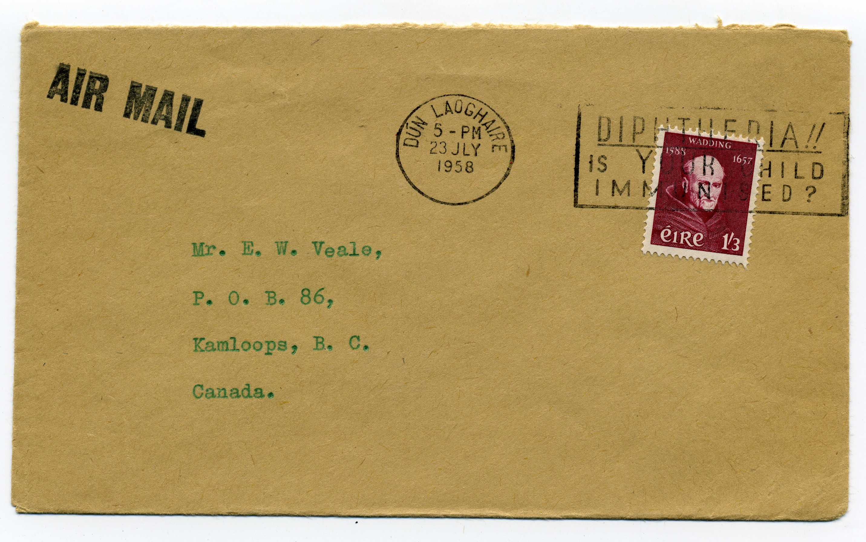 PH079 Image | 1957 Wadding 1-3d used on airmail cover with 1958 Dun Laoghaire machine cancel.