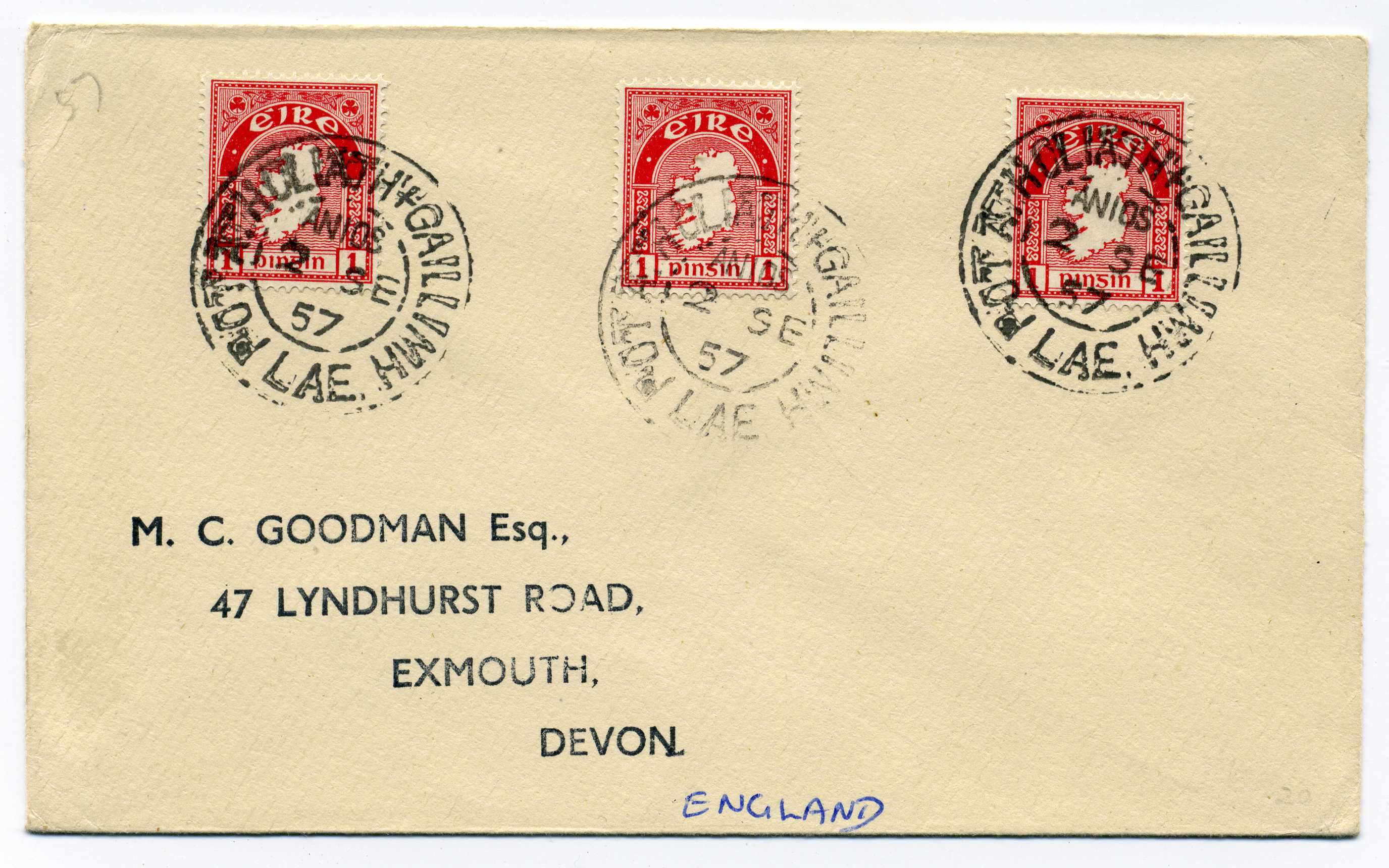 PH080 Image | 1957 Dublin Galway TPO cancels on three 1d adhesives used on cover to England.