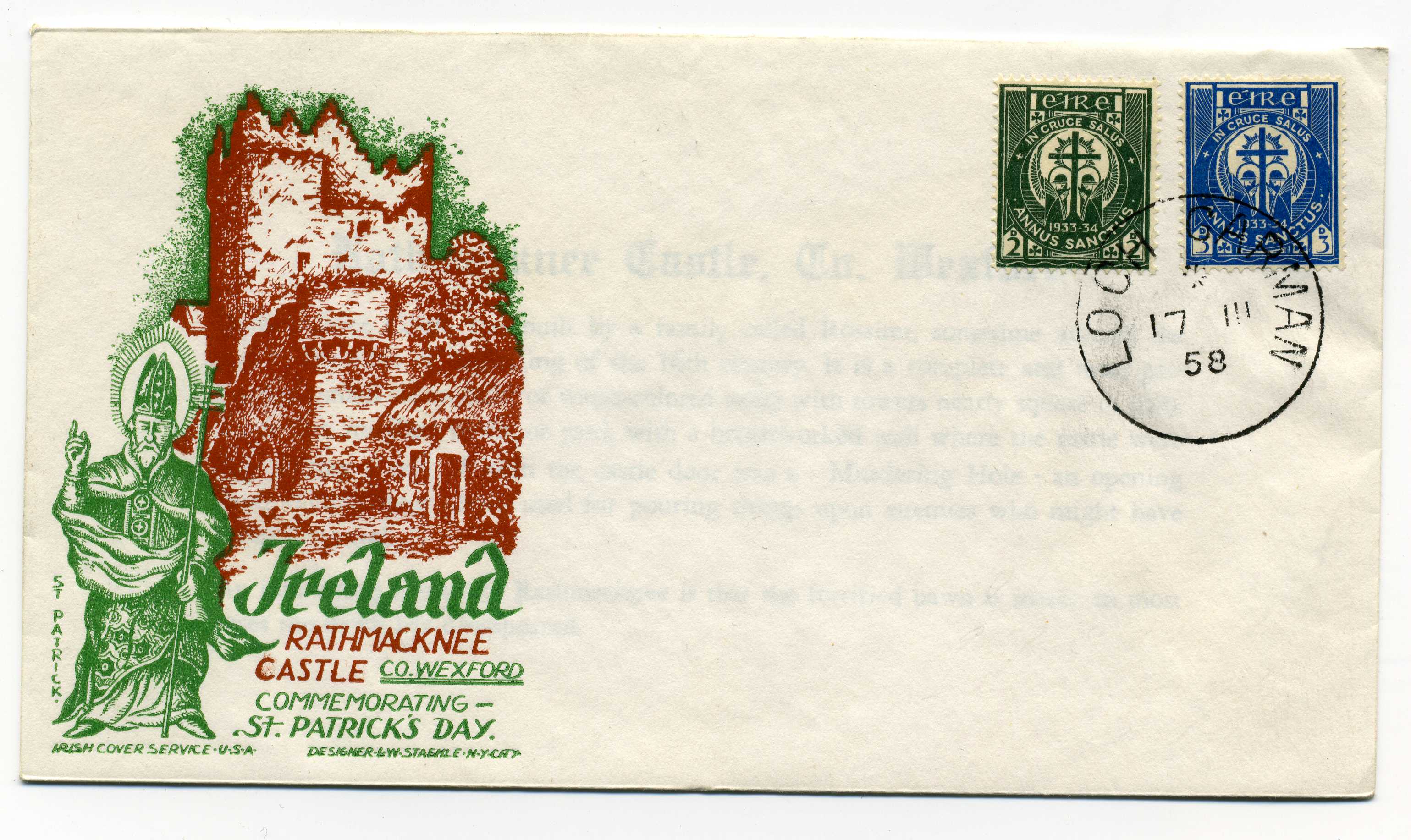 PH081.5 Image | 1957 Illustrated Cover of Rathmacknee Castle bearing 1933 Holy Year set tied by Loch Garman cds cancel