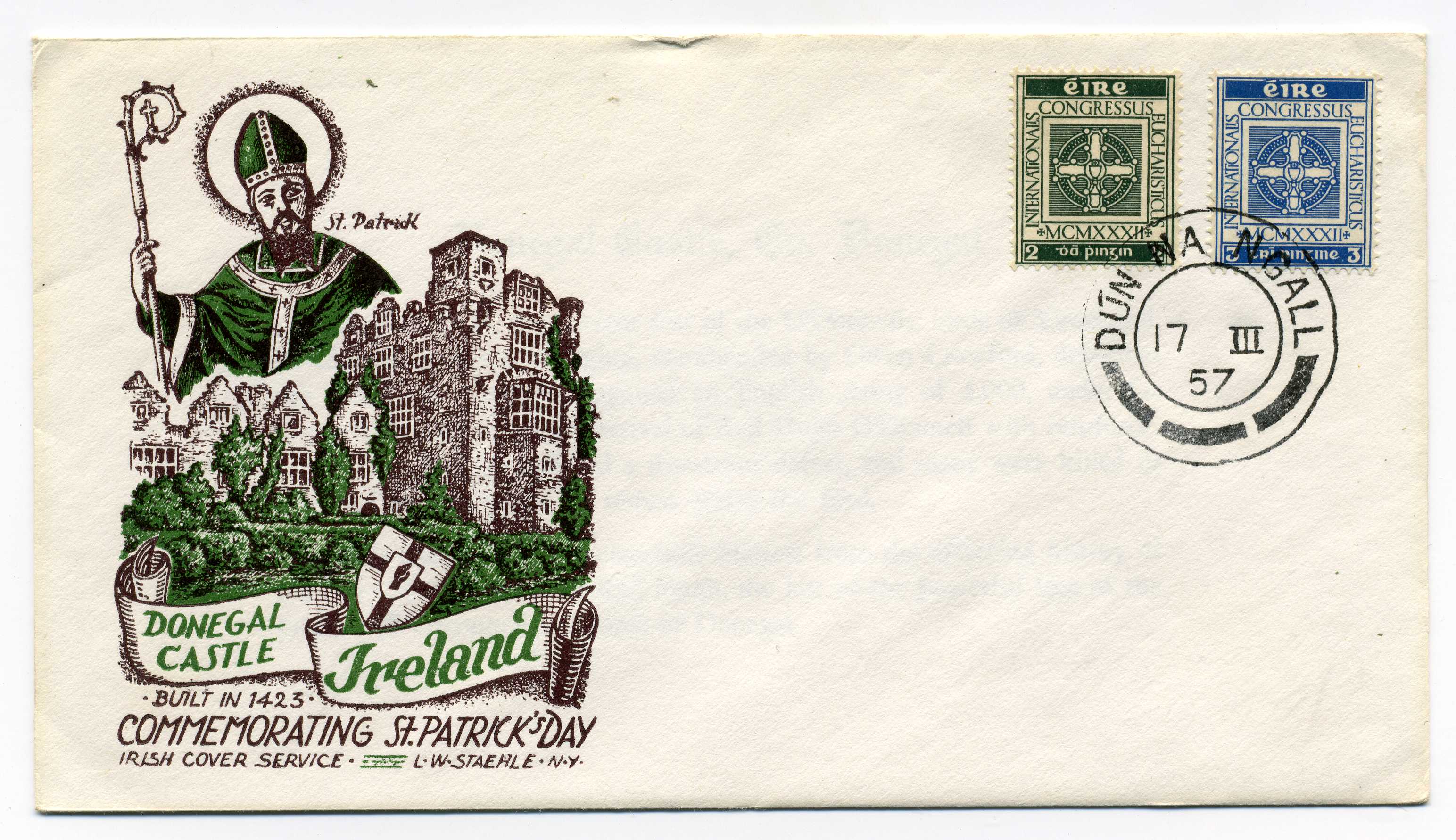 PH081 Image | 1957 Illustrated Cover of Donegal Castle bearing Eucharistic Congress set tied by Donegal cds cancel.