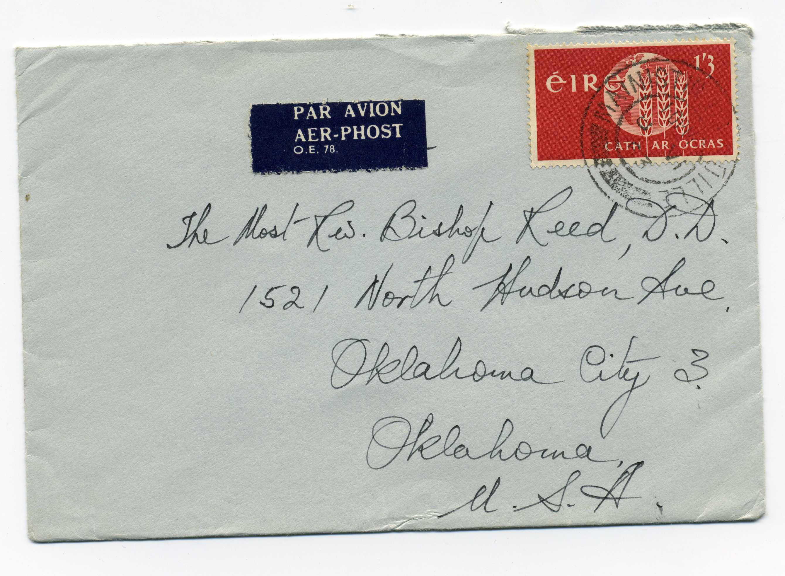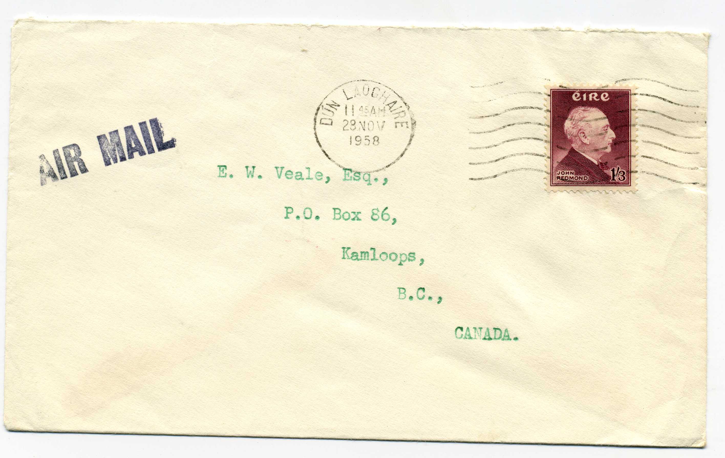 PH083 Image | 1957 John Redmond 1-3d used on airmailcover with 1958 Dun Laoghaire machine cancel.