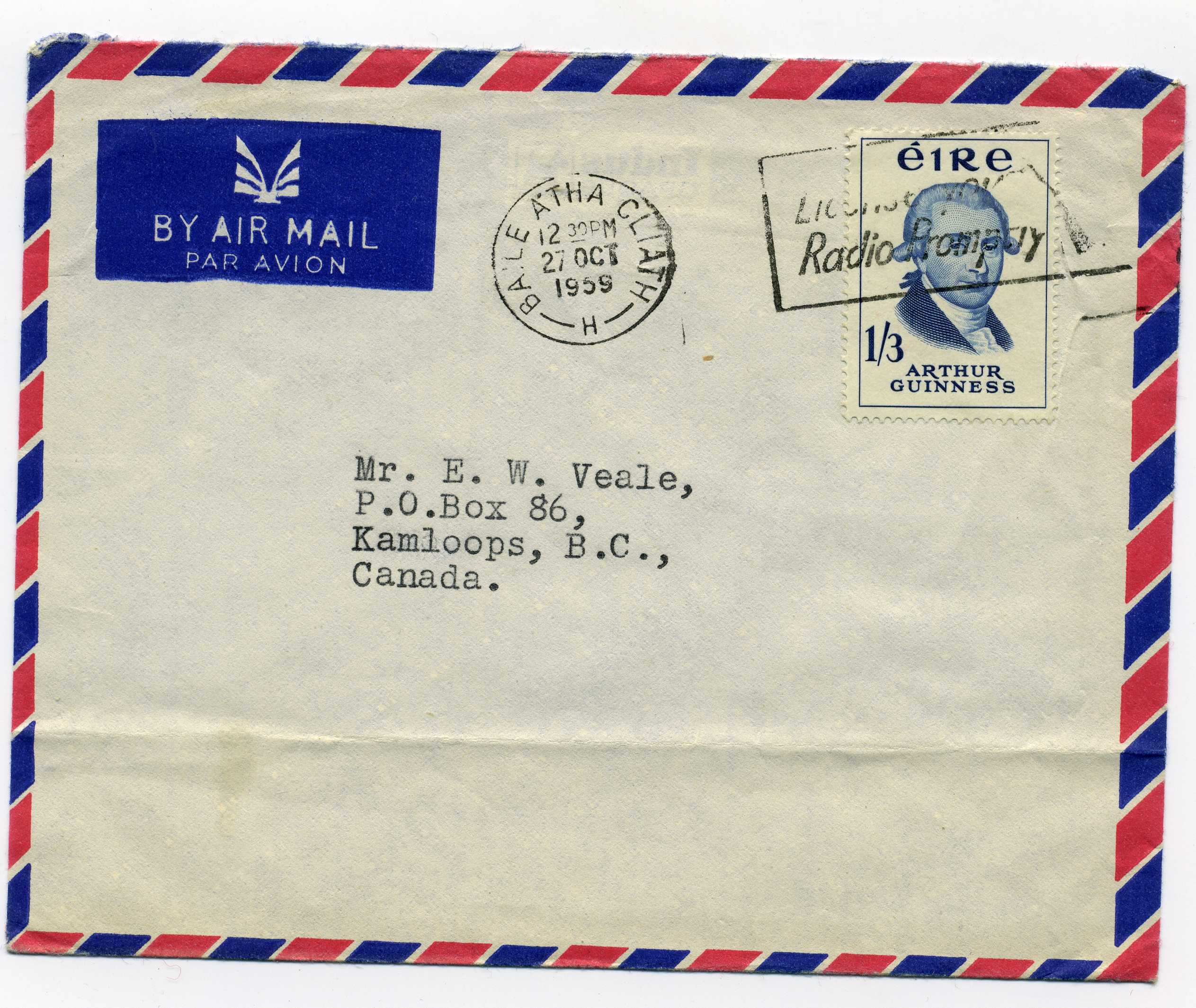PH093 Image | 1959 Arthur Guinness 1-3d used on airmail cover with Dublin slogan cancel.