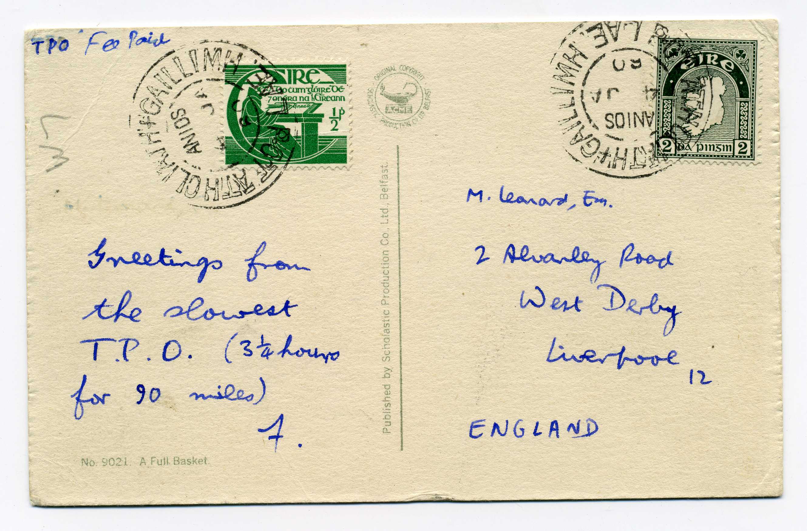 PH098 Image | 1960 Postcard bearing 2d and ½d adhesives tied by individual strikes of Dublin Galway TPO Day Up.