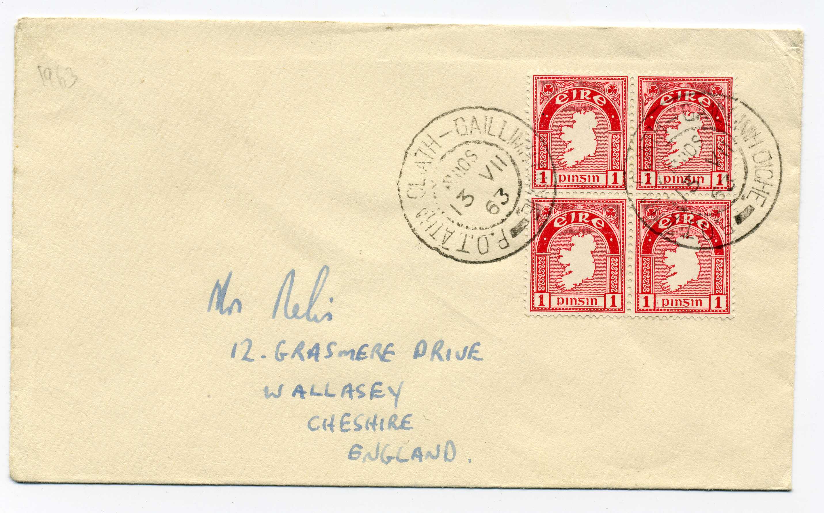 PH100 Image | 1963 Cover bearing block of four 1d adhesives tied by Dublin Galway TPO cancel