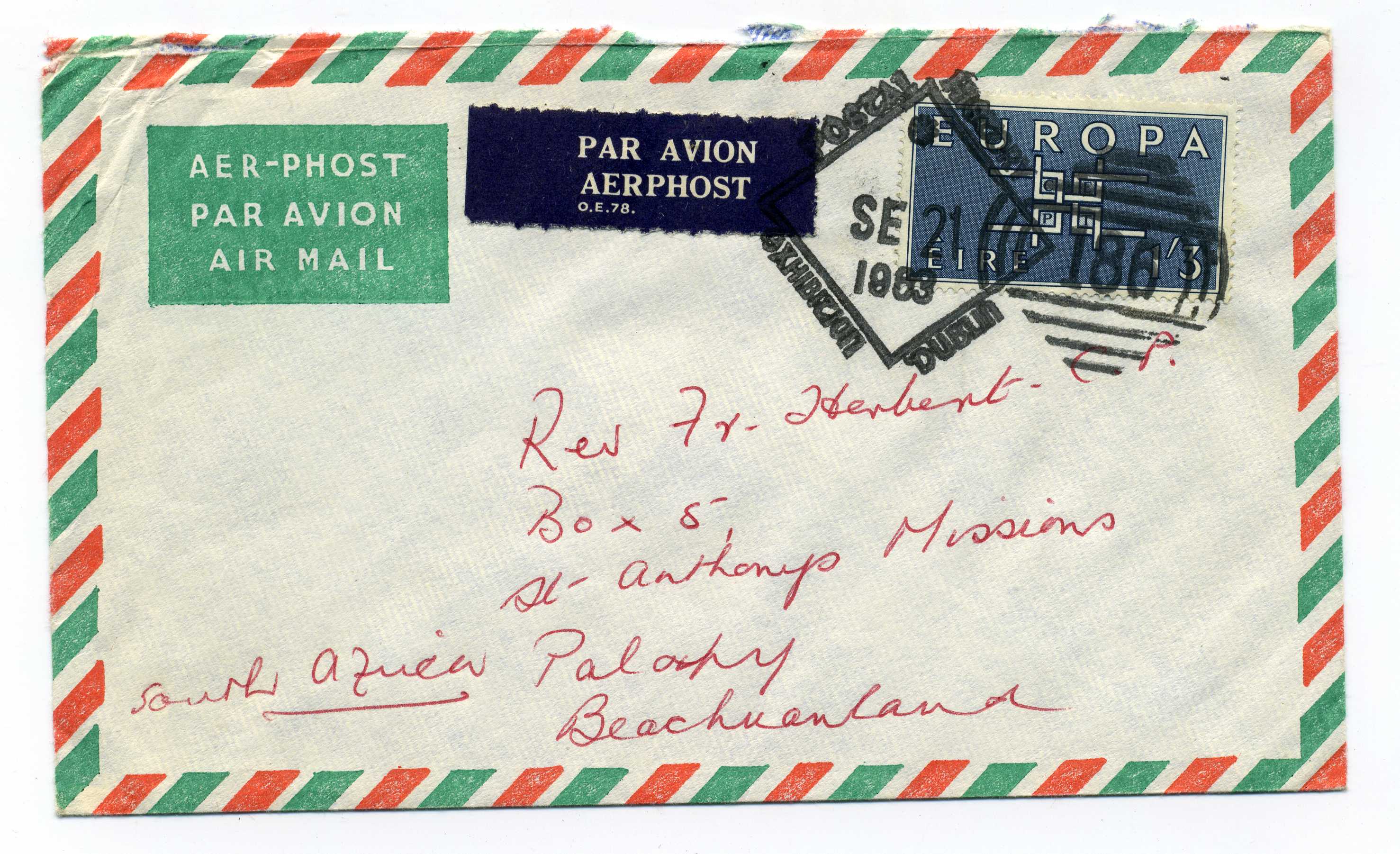 PH102 Image | 1963 Cover to South Africa bearing Europa 1-3d tied by souvenir Duplex Dublin Postal History Exhibition, an unusual commercial use