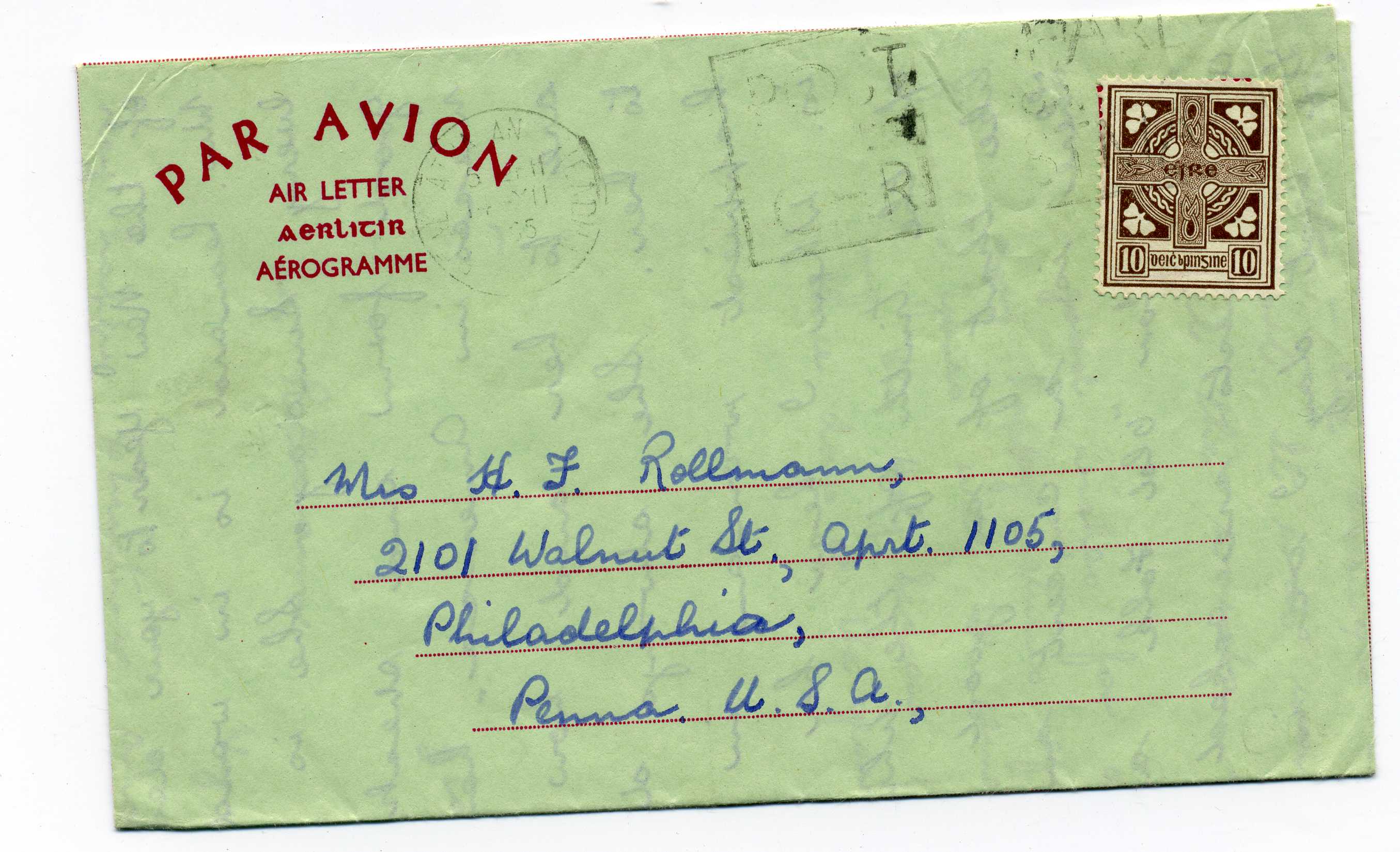 PH109.1 Image | 1965 Aerogramme used to USA with 10d Adhesive tied by Ballina machine cancel, FAI AF4g