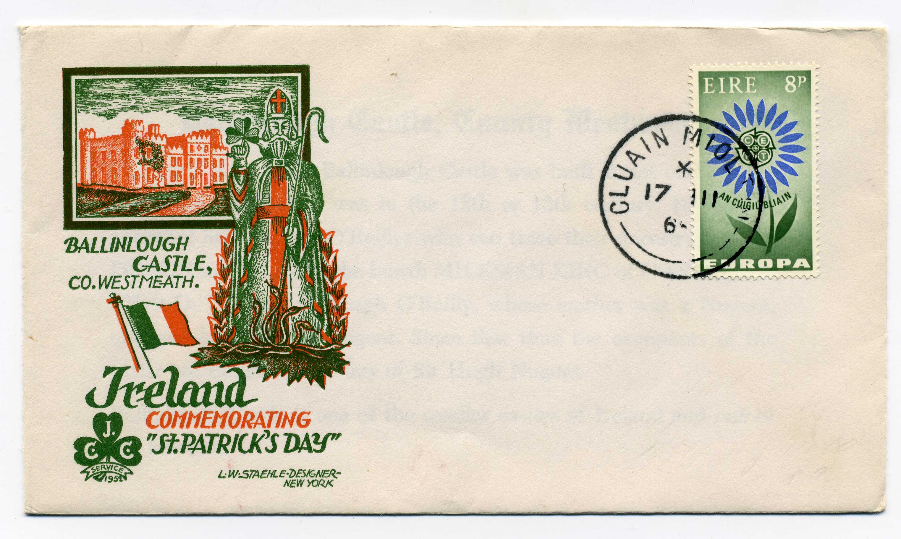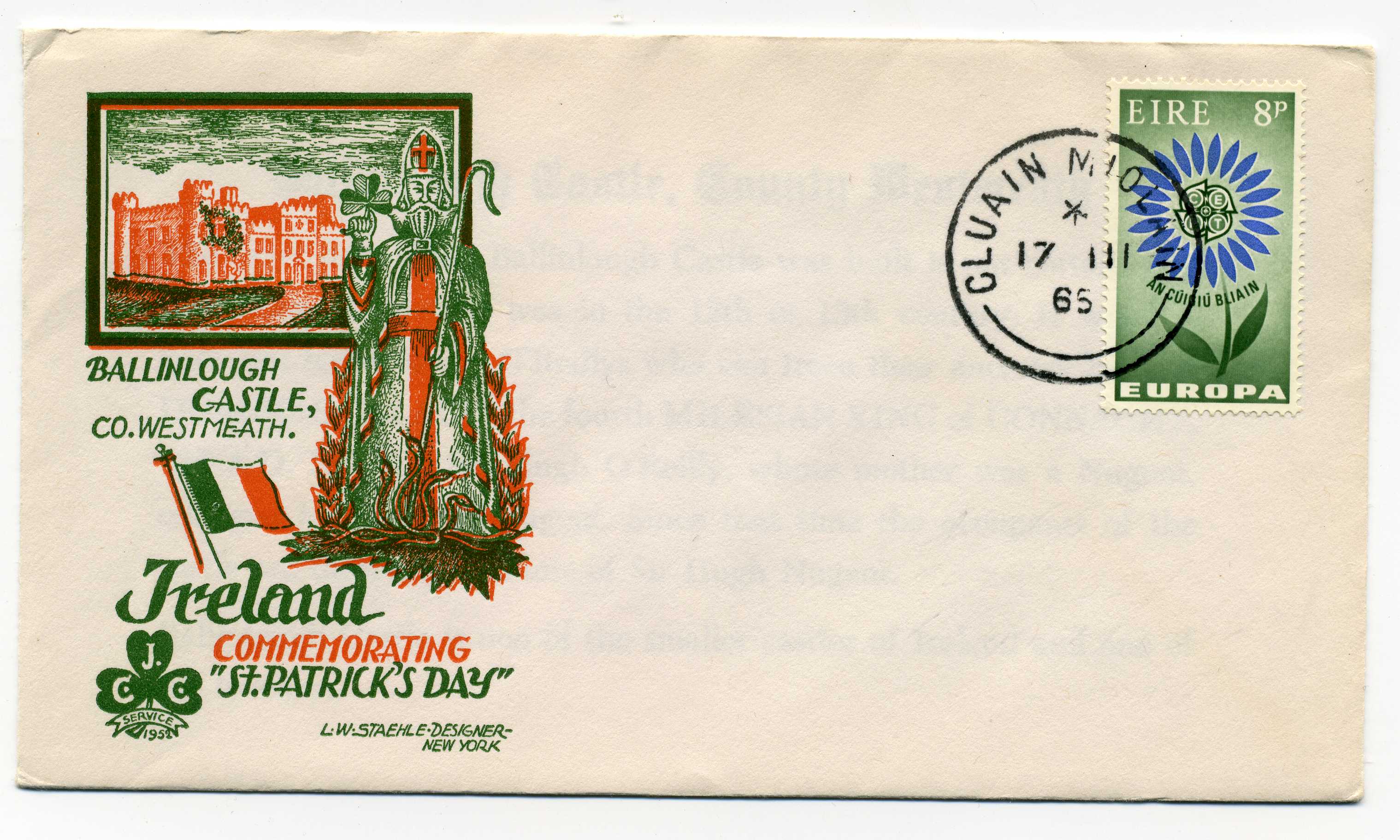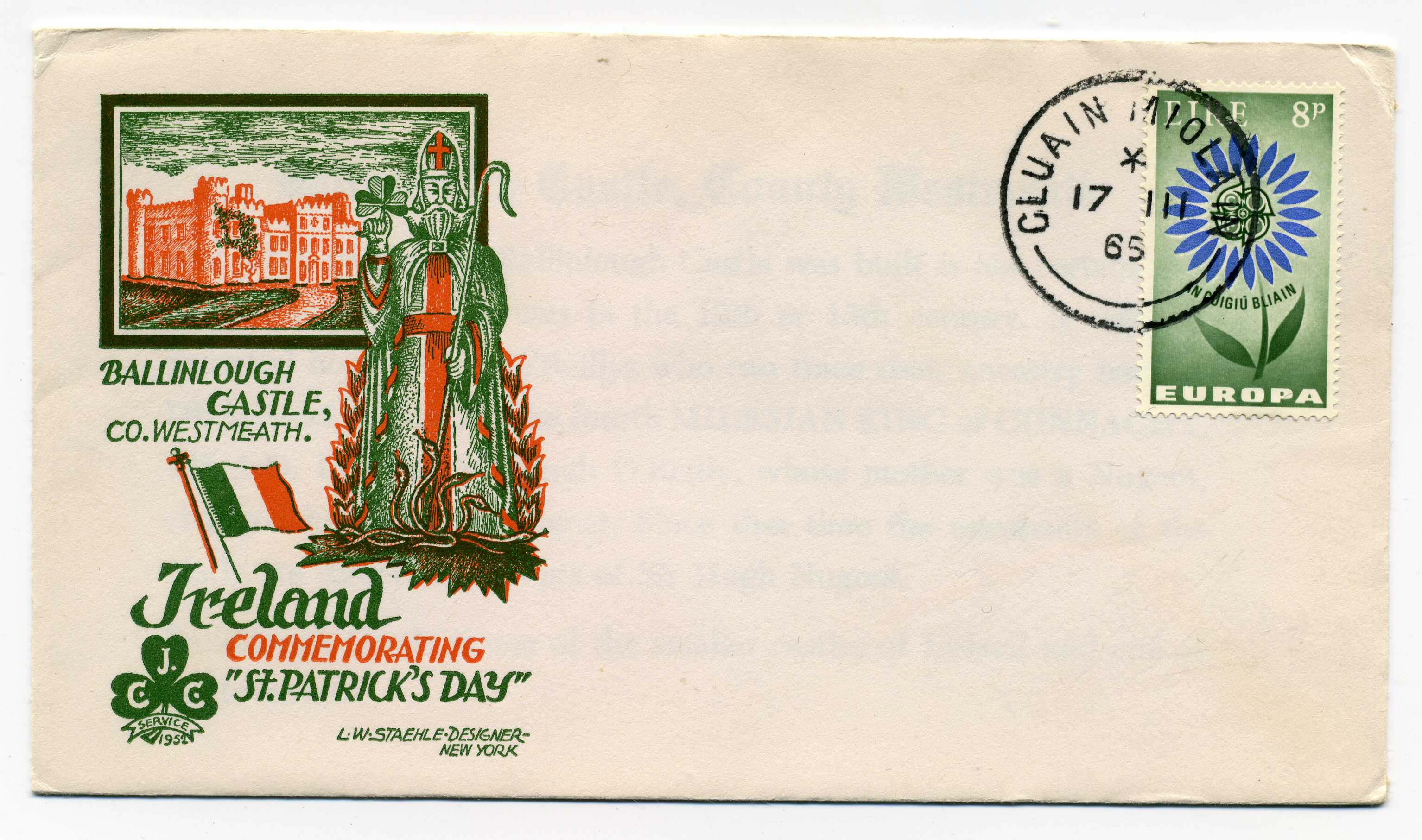 PH109 Image | 1965 Illustrated Cover of Ballinlough Castle bearing 8d adhesive tied by Cluain Miolt cds cancel.