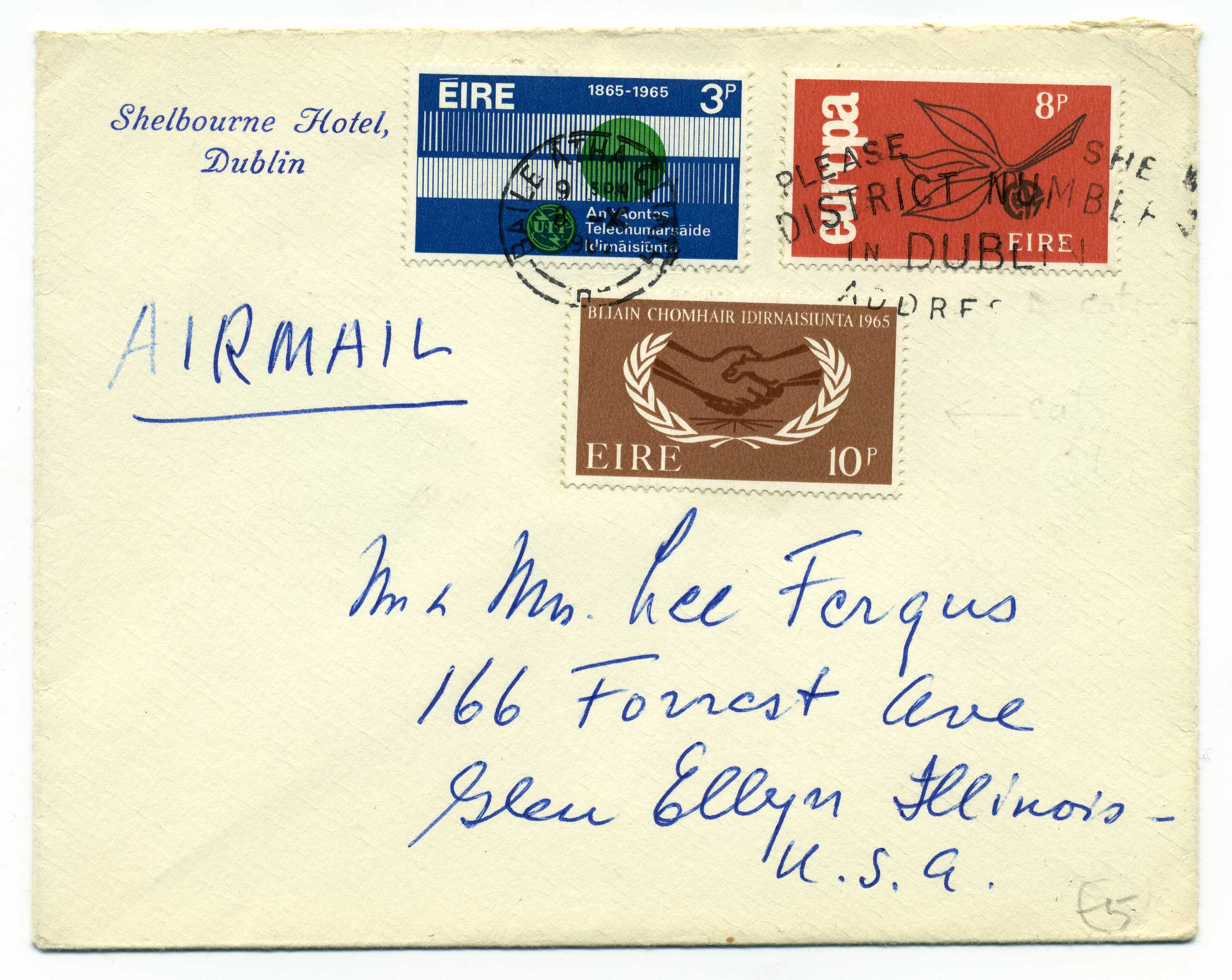 PH112.1 Image | 1965 Shelbourne Hotel cover bearing ITU 3d, Europa 8d and ICY 10d all tied by Dublin slogan cancel