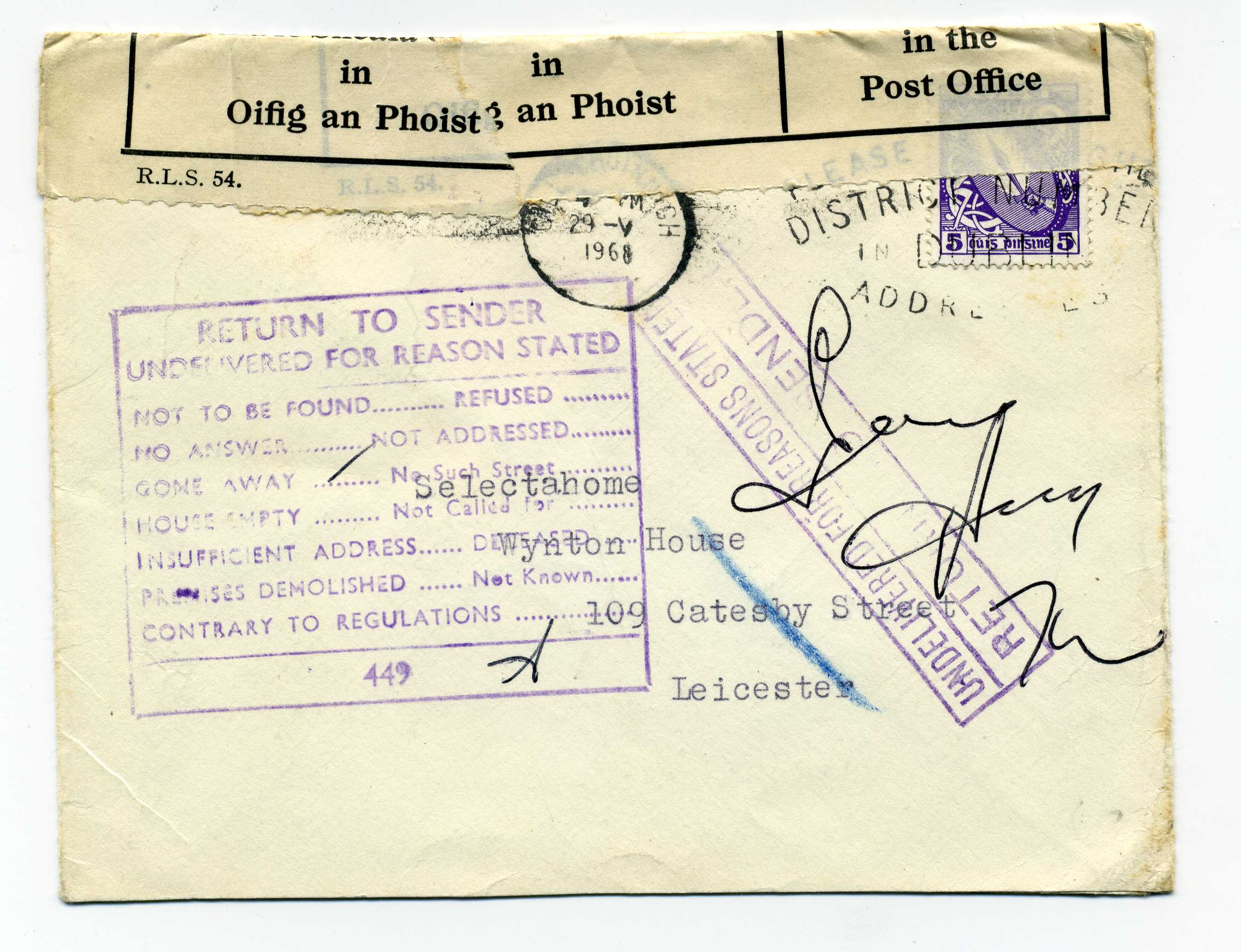PH113.5 Image | 1968 Undelivered Cover returned to sender with instructional label and with Officially Sealed in the Post Office tape, good strike of Returned Letter Branch on reverse.
