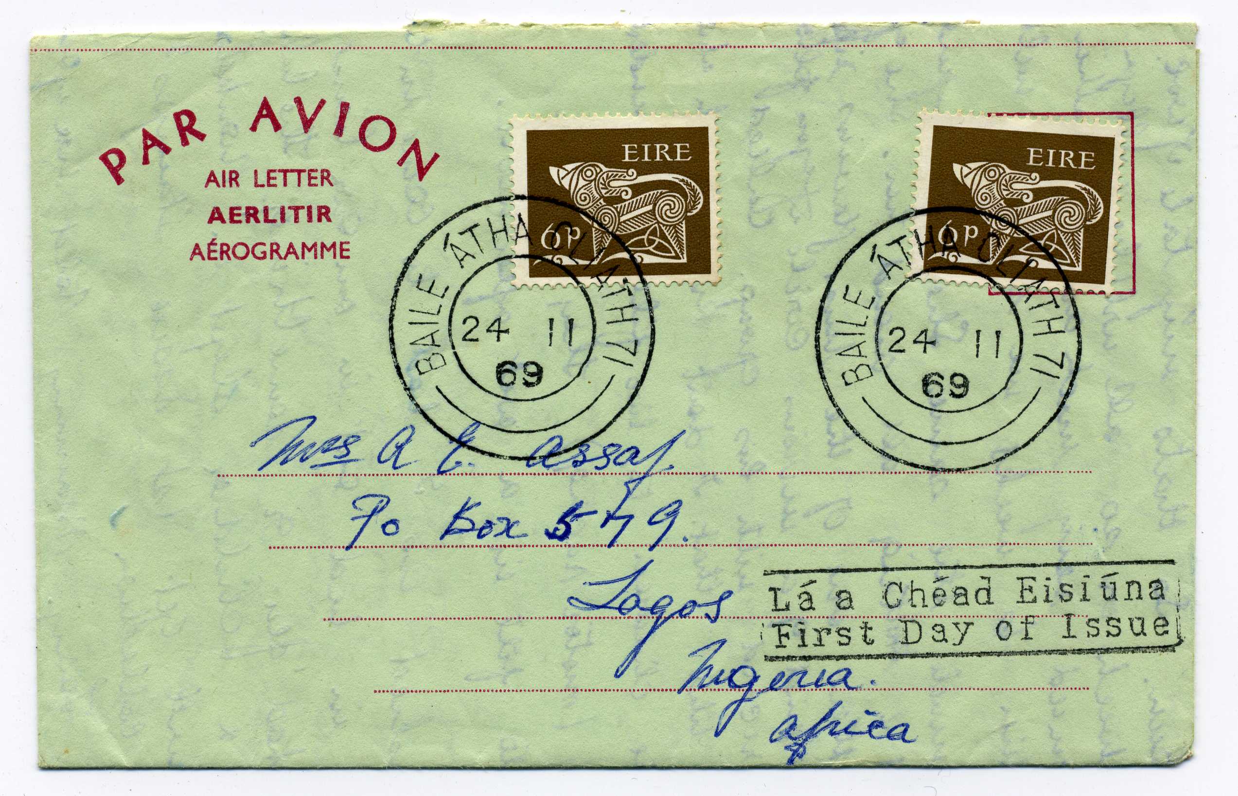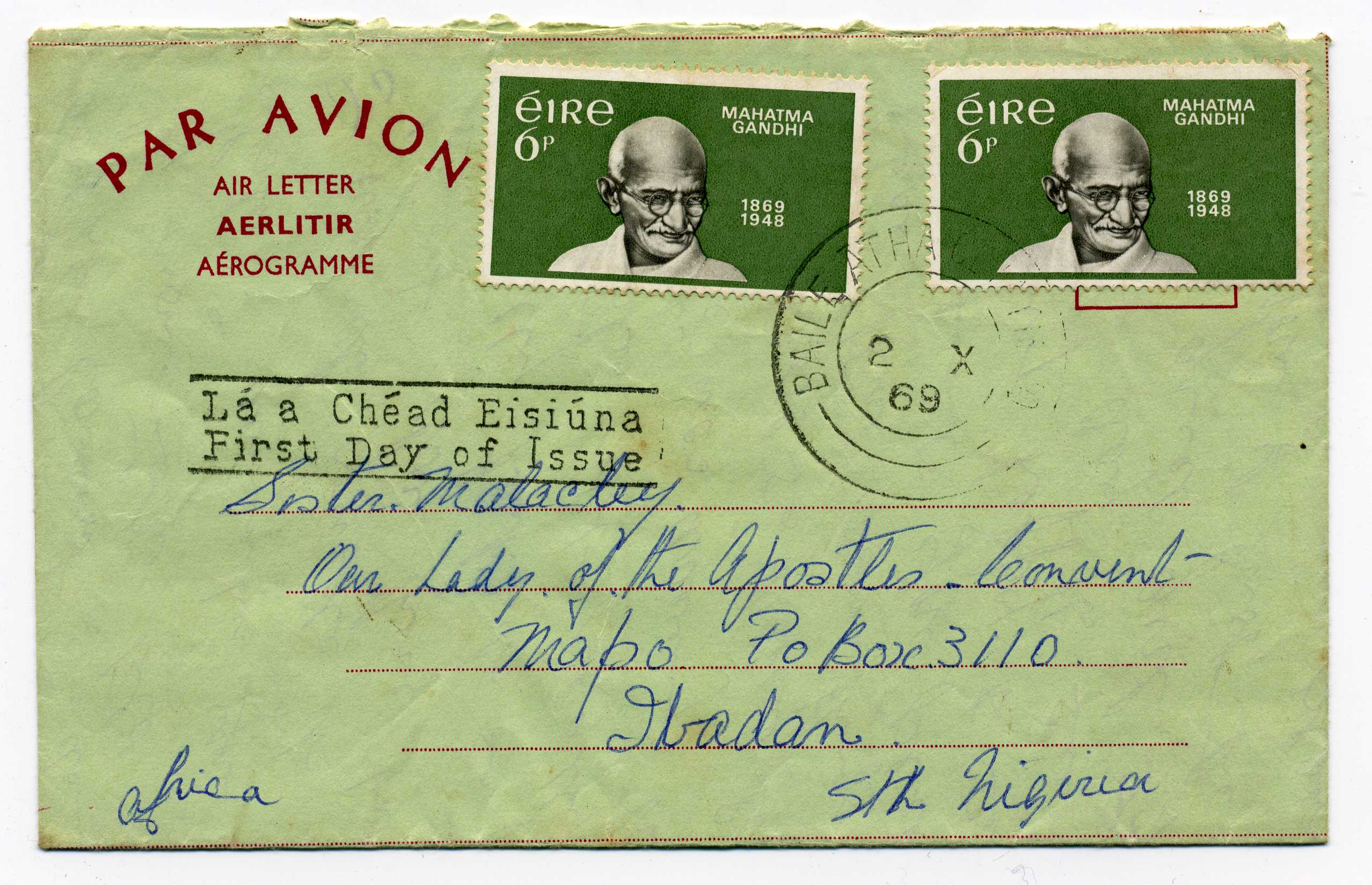 PH114 Image | 1969 Aerogramme used to India bearing two 6d Gandhi stamps tied by cds cancels
