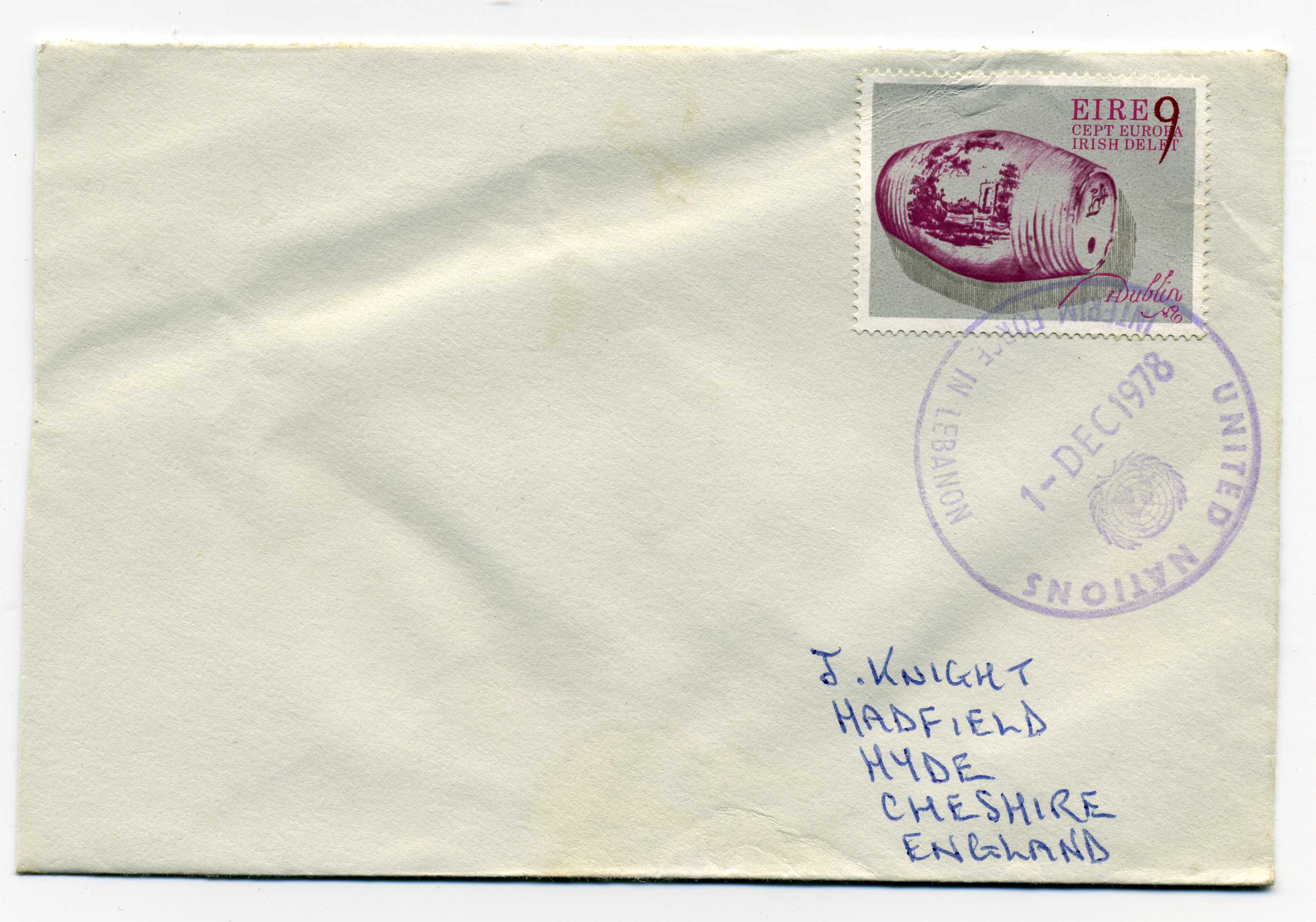 PH117.1 Image | 1978 Cover to Cheshire with excellent strike in purple of "United Nations Interim Force in Lebanon" tying 1976 Europa 9p value