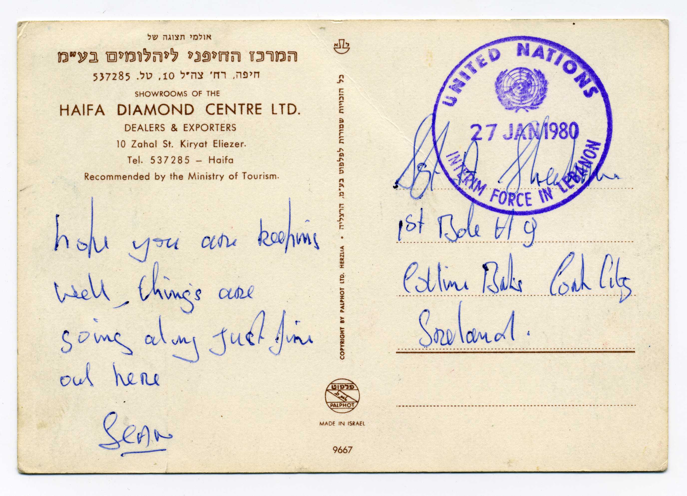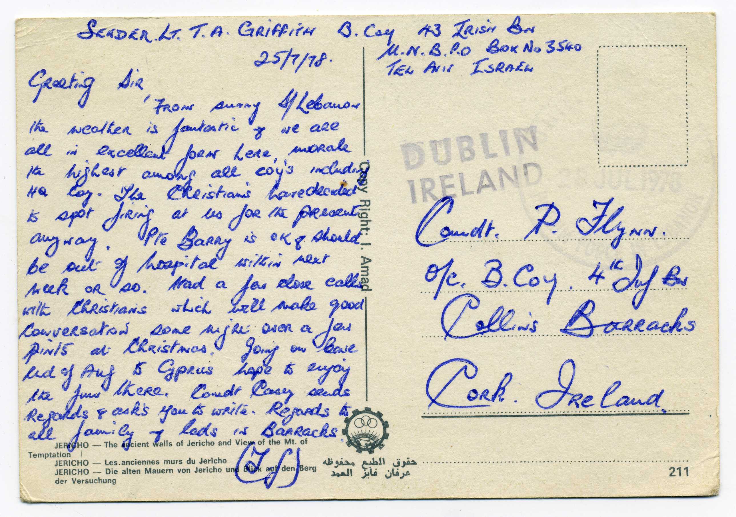 PH118.2 Image | 1980 Postcard to Cork with excellent strike in purple of "United Nations Interim Force in Lebanon" 27/1//80
