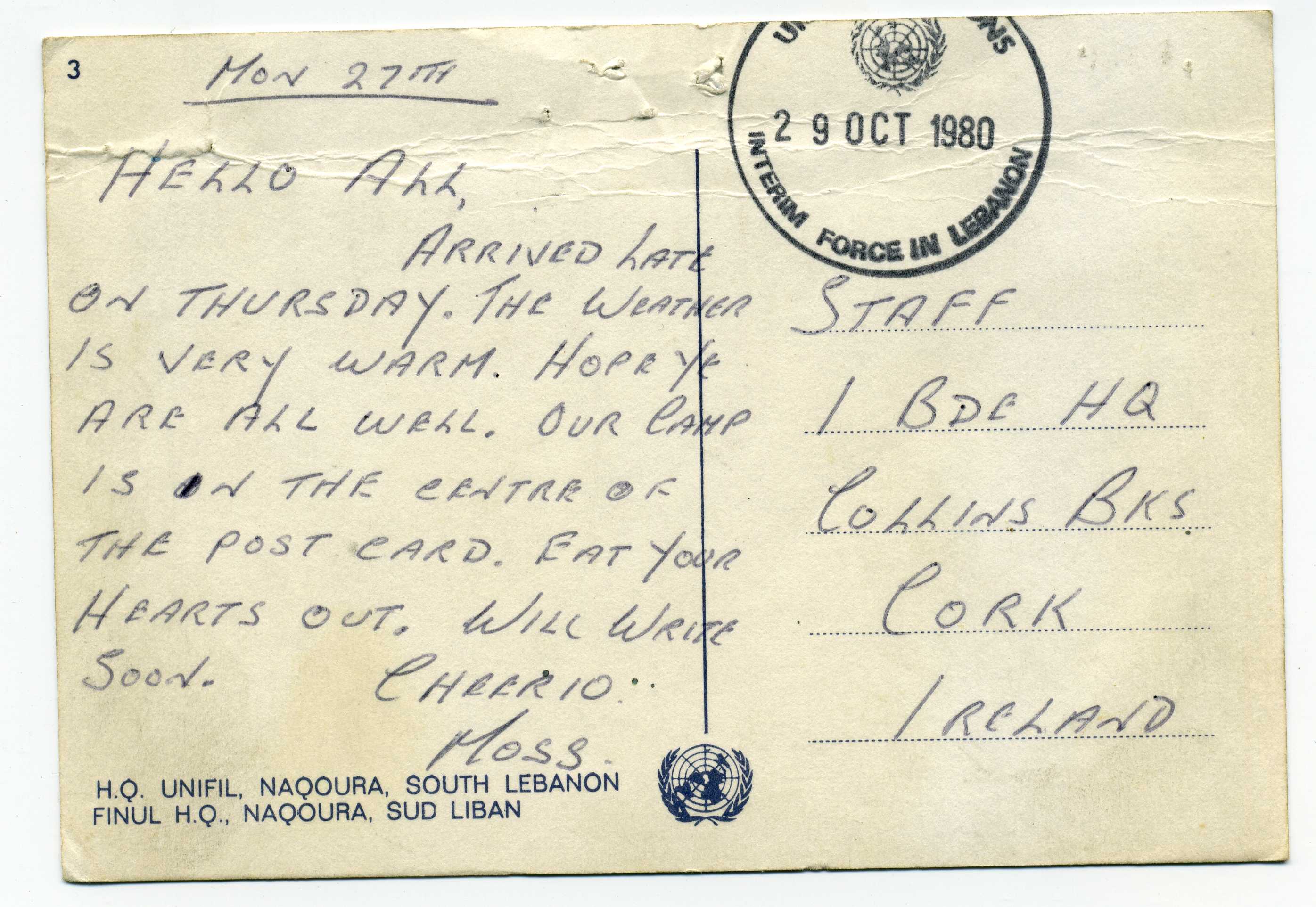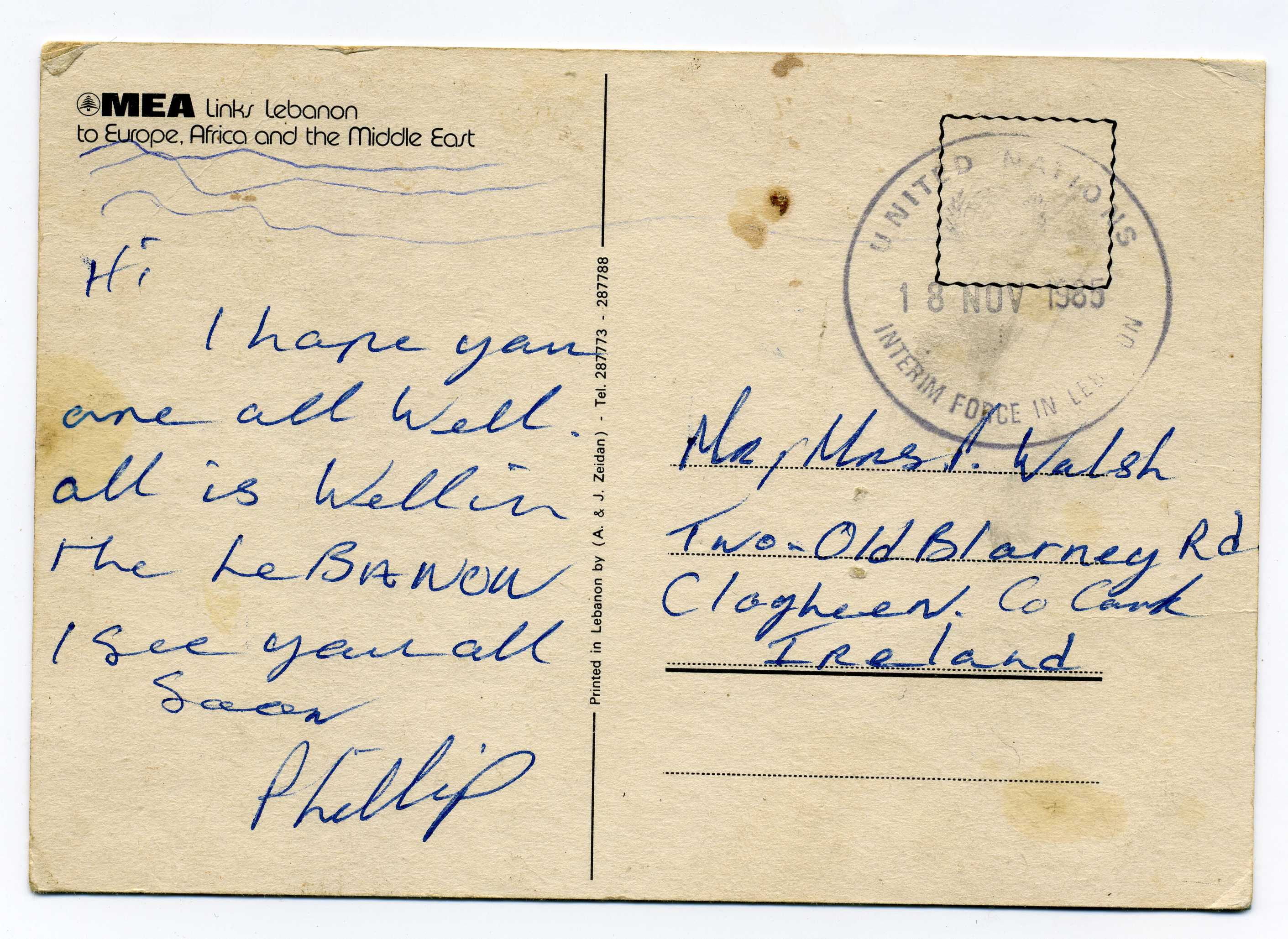 PH118.3 Image | 1980 Postcard to Cork with excellent strike in black of "United Nations Interim Force in Lebanon" 29/10//80