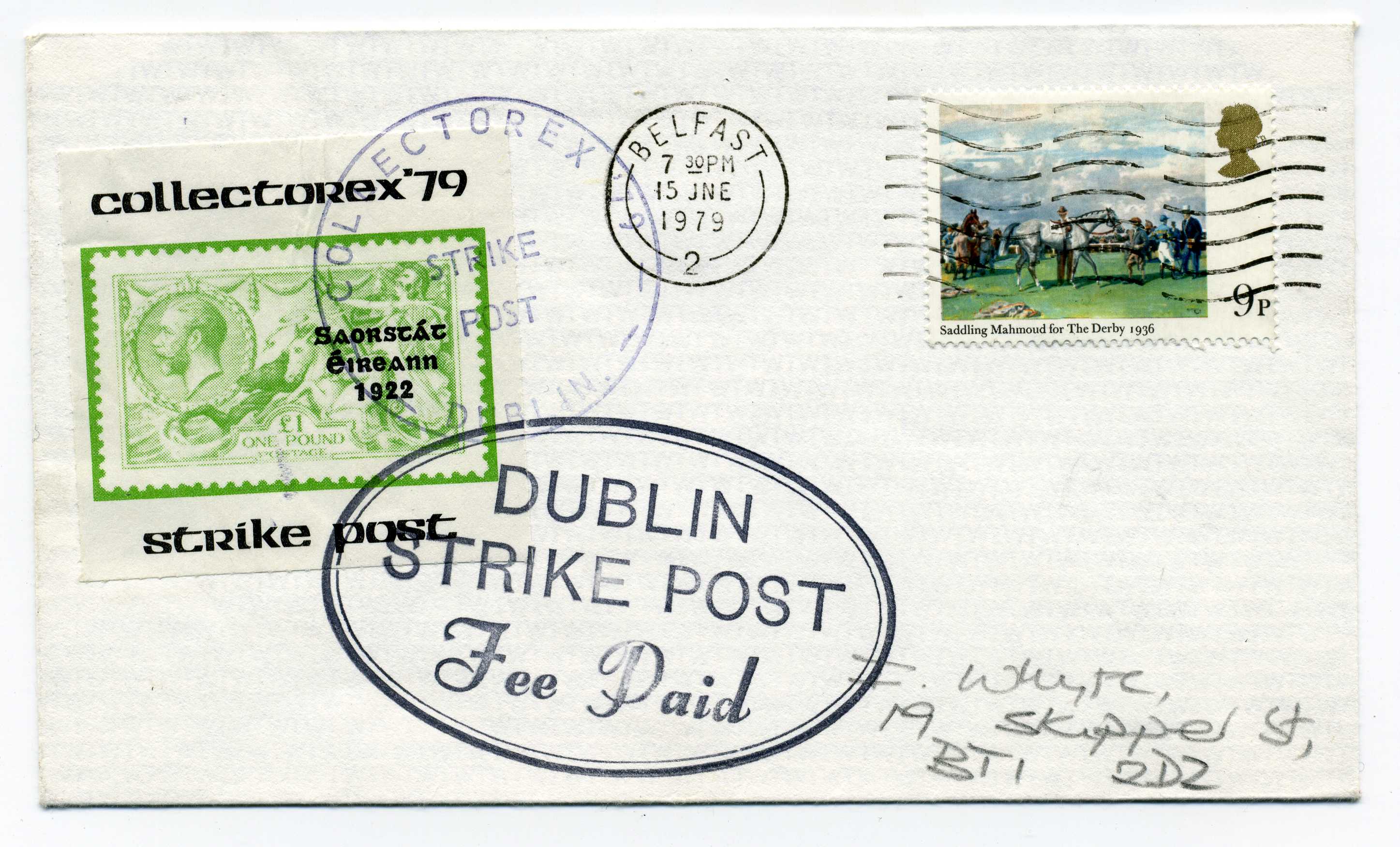 PH118 Image | 1979 Cover bearing Collectorex '79 Strike Post label tied by 2 strike post cancels and with 9p adhesive tied Belfast slogan cancel.