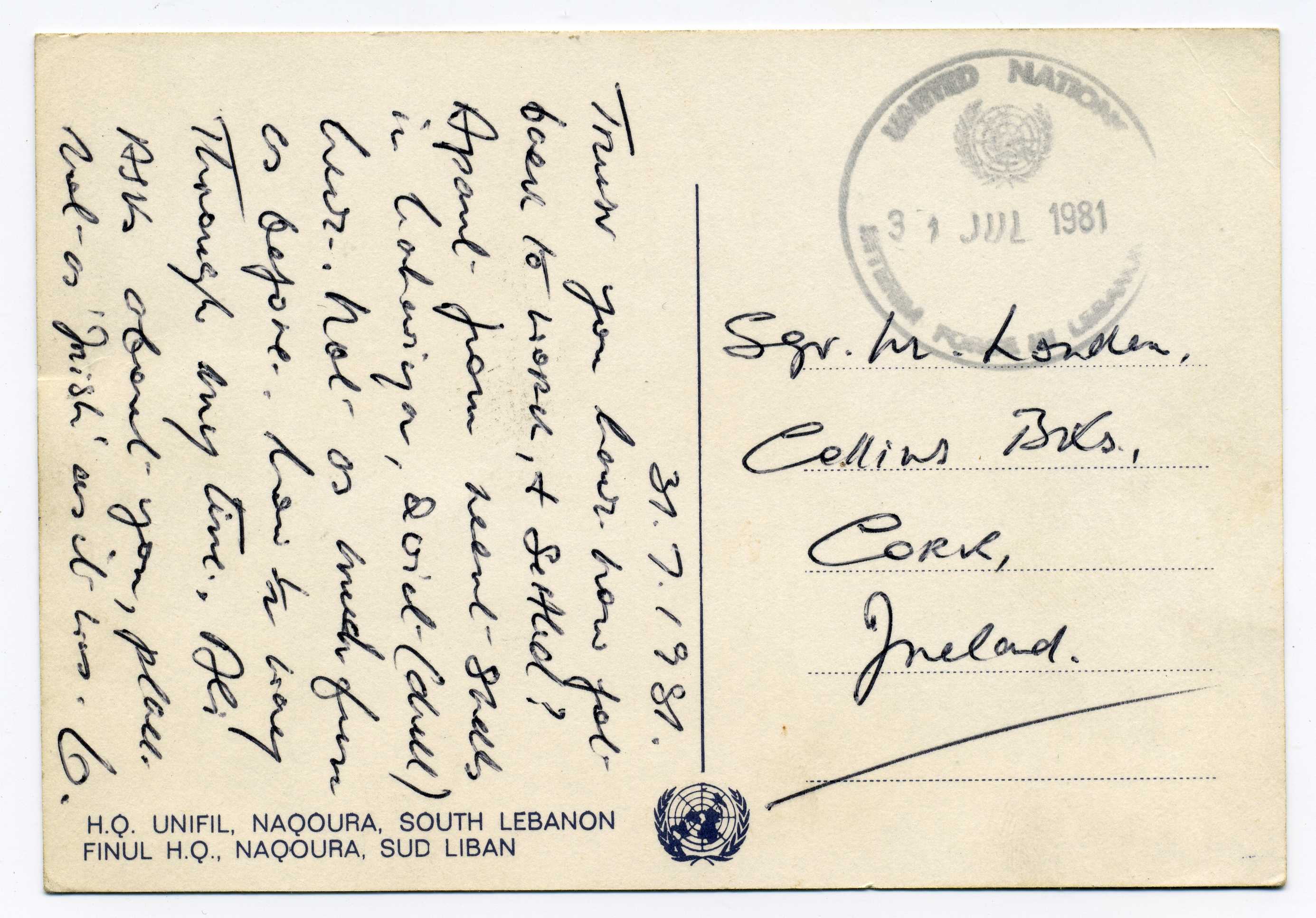 PH119.05 Image | 1981 Postcard to Cork with very good strike in black of "United Nations Interim Force in Lebanon" 31/7/81
