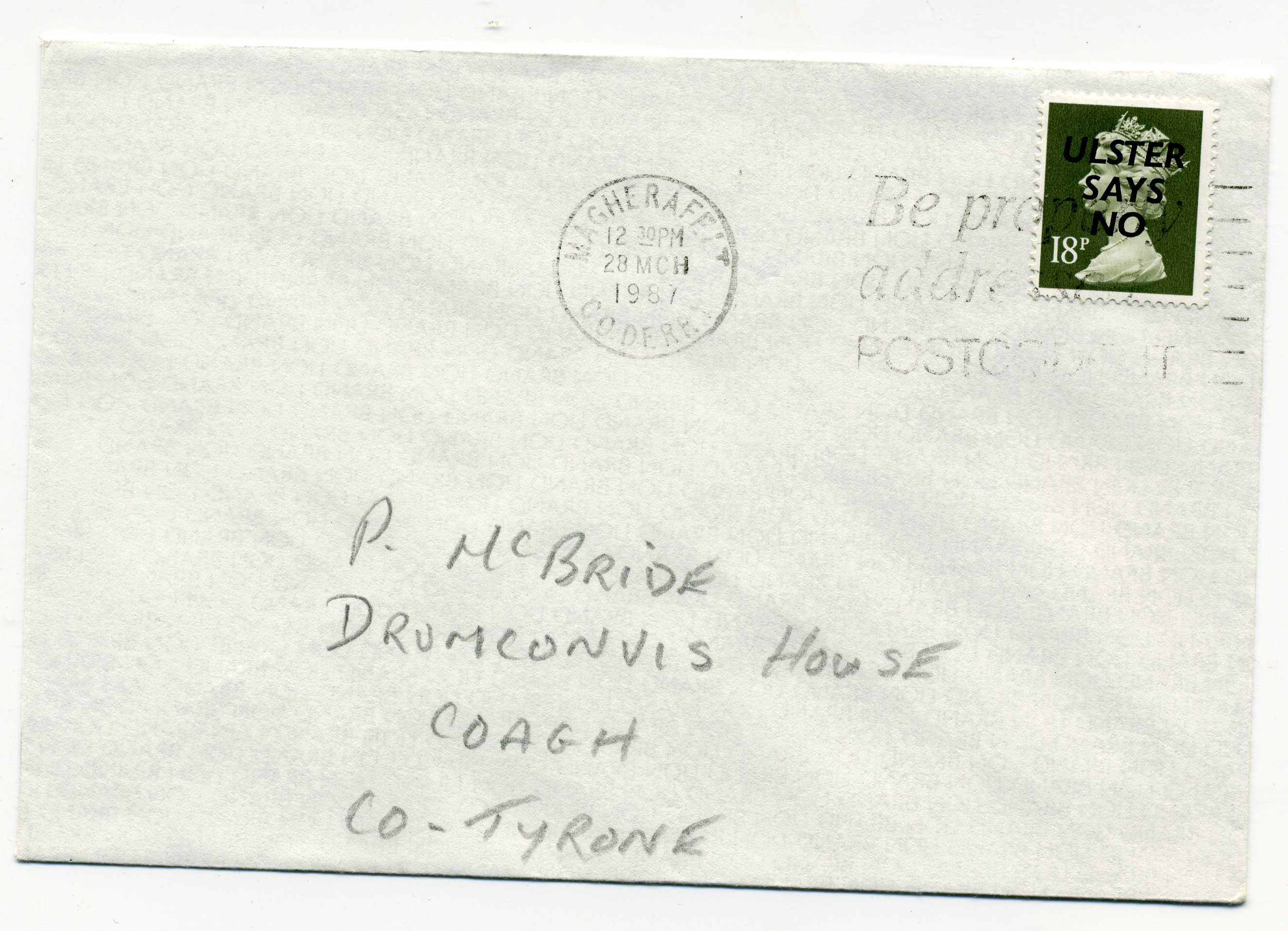 PH119.17 Image | 1987 Ulster Says No overprint (Bold Slanted Type) on 18p definitive used on cover with Magherafelt slogan cancel.