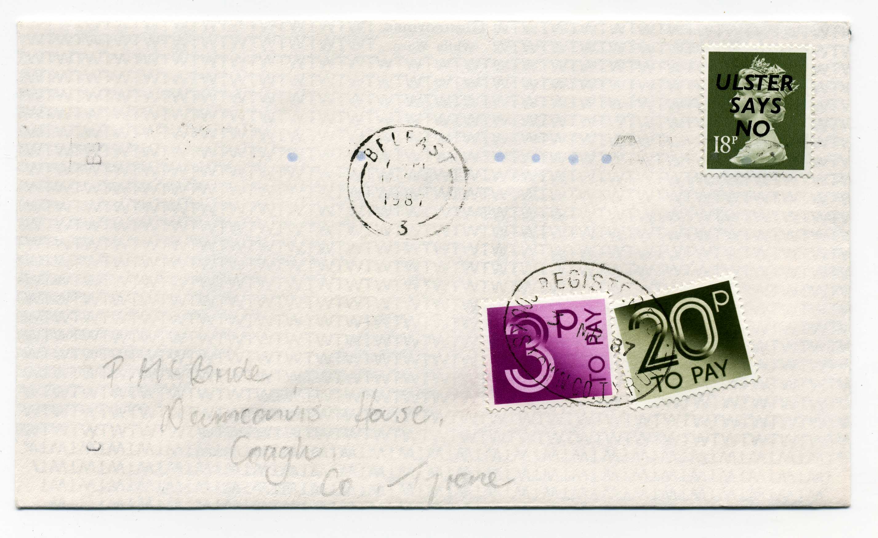 PH119.18 Image | 1987 Ulster Says No overprint (Bold Slanted Type) on 18p definitive used on cover with Belfast slogan cancel and with 3p and 20p Postage Dues.