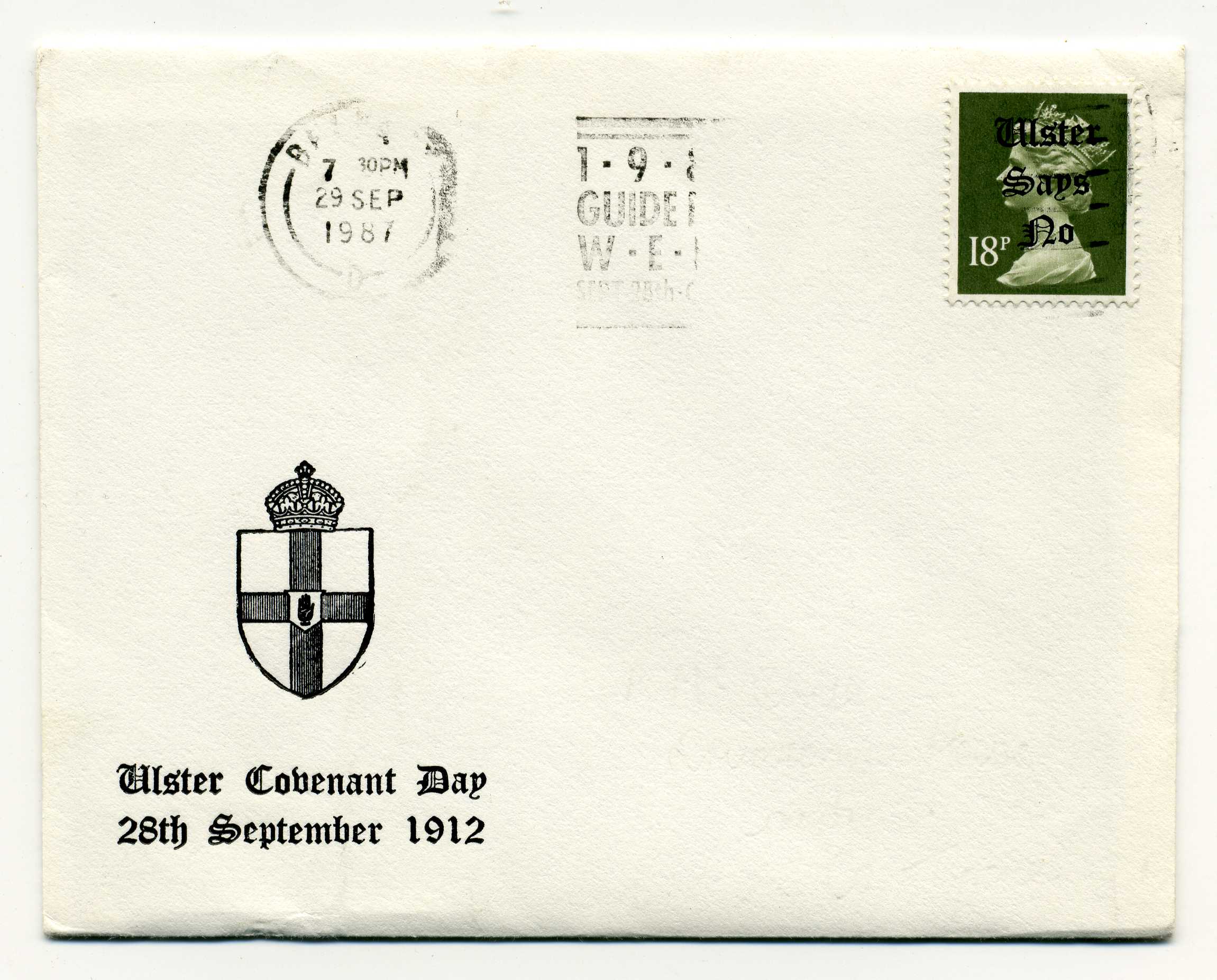 PH119.21 Image | 1987 Ulster Covenant Day cover with 18p definitive with Ulster Says No overprint (Fancy Type) used on cover with Belfast slogan cancel