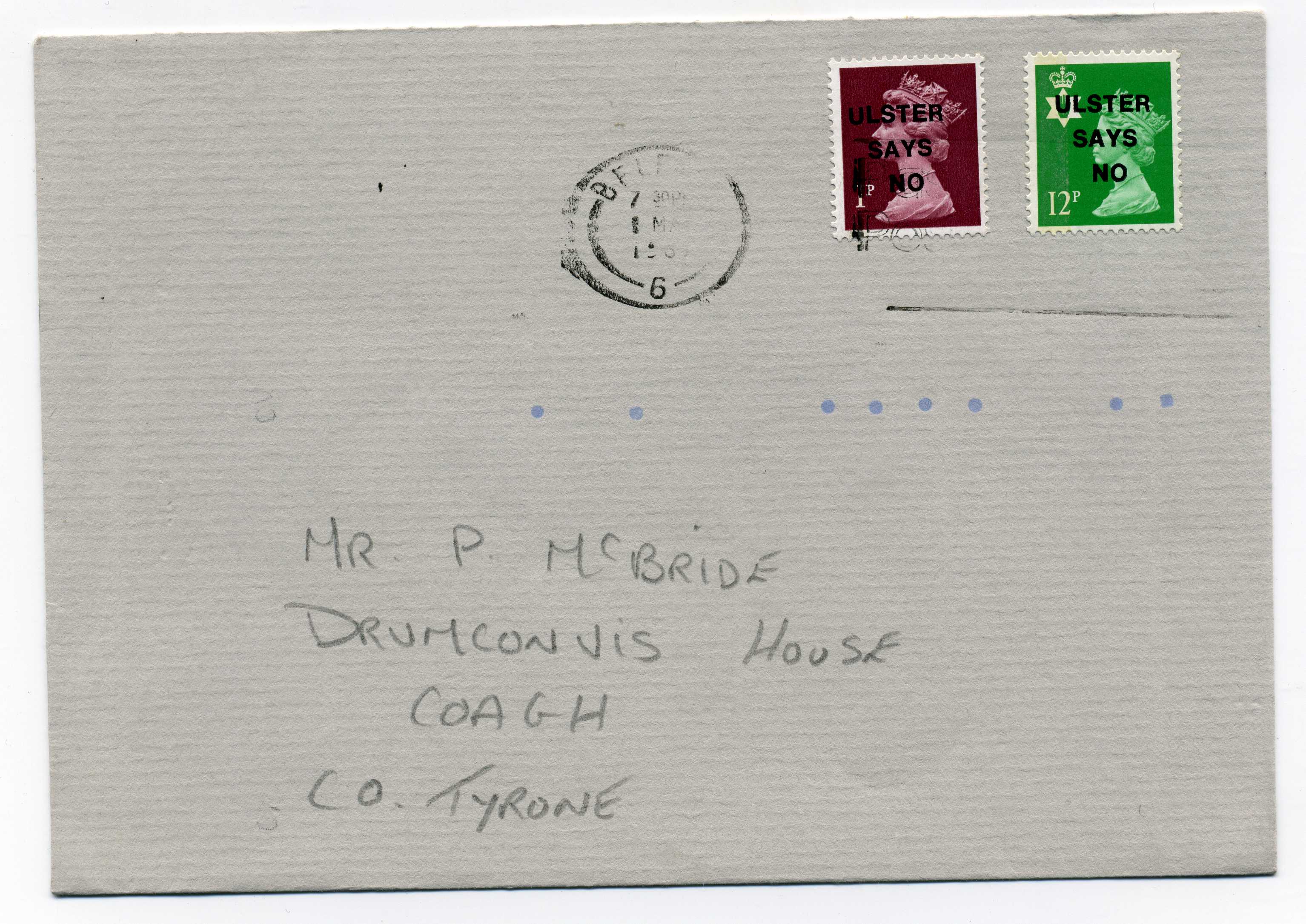 PH119.23 Image | 1987 Ulster Says No overprint (Bold Straight Type) on 1p and 12p Regional used on cover with Belfast slogan cancel.