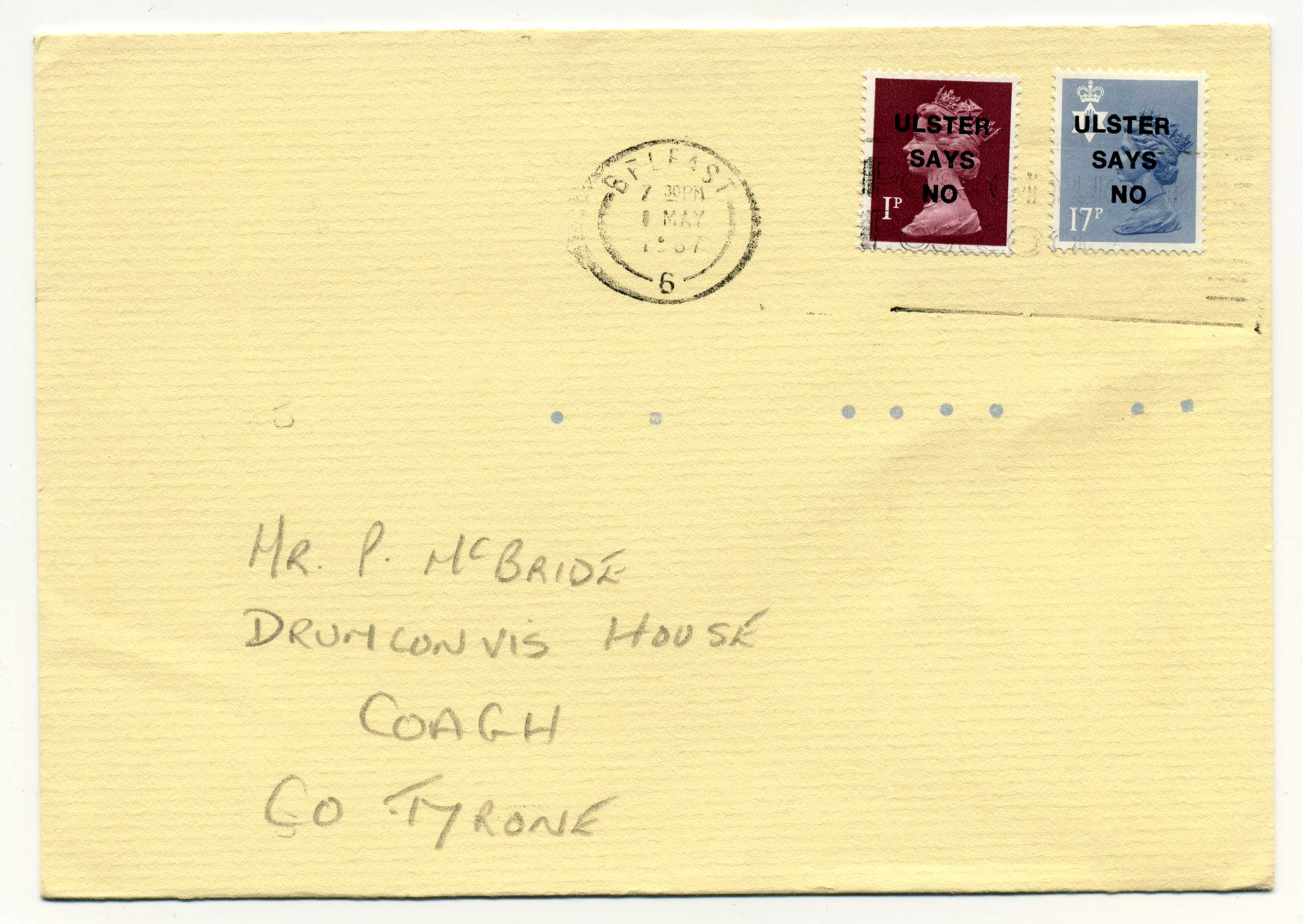PH119.24 Image | 1987 Ulster Says No overprint (Bold Straight Type) on 1p and 17p Regional used on cover with Belfast slogan cancel.