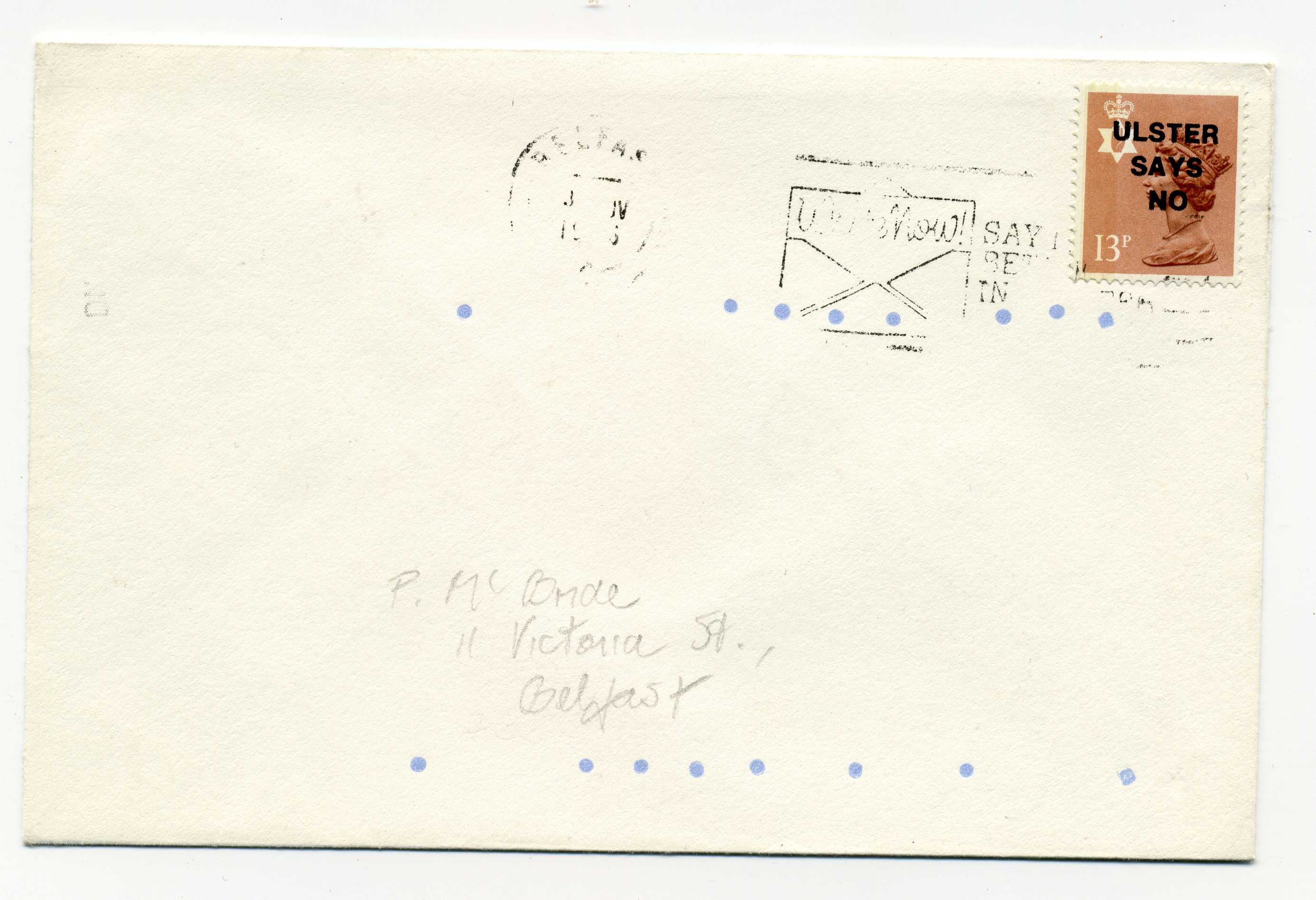 PH119.25 Image | 1987 Ulster Says No overprint (Bold Straight Type) 13p Regional used on cover with Belfast slogan cancel.