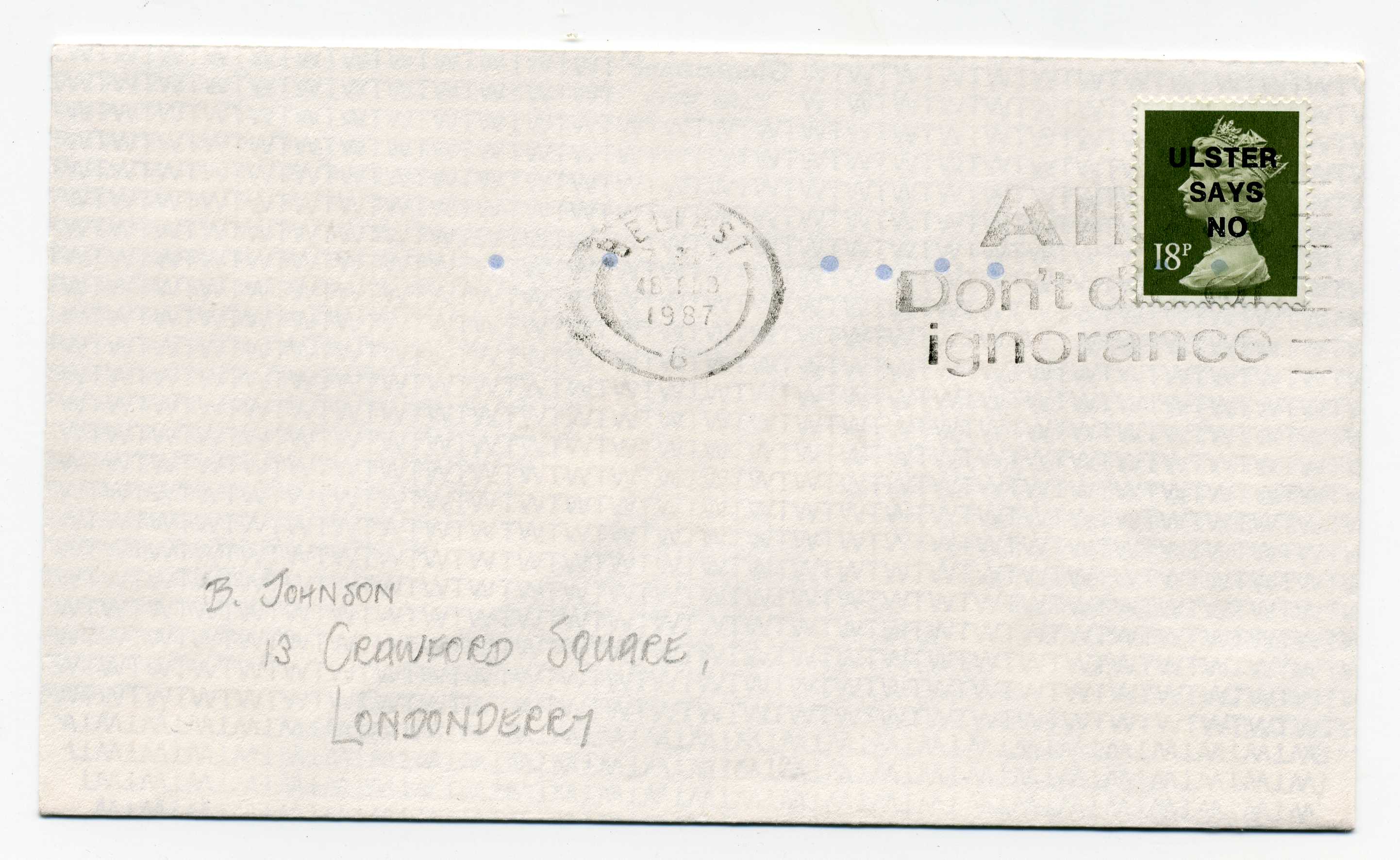 PH119.27 Image | 1987 Ulster Says No overprint (Bold Straight Type) on 18p definitive used on cover with Belfast slogan cancel