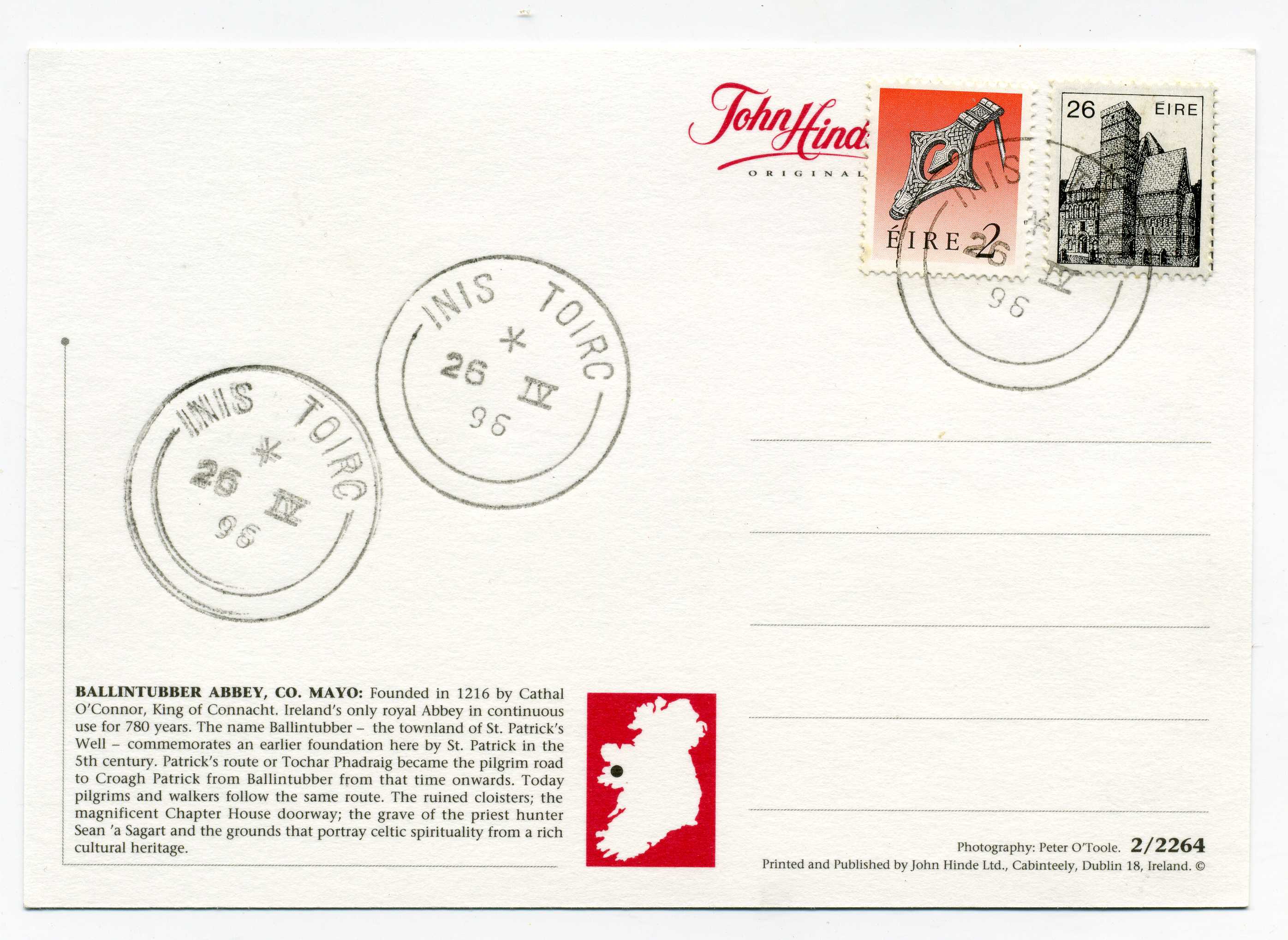 PH120.5 Image | 1996 Picture Postcard Ballintubber Abbey used with excellent strike of Inis Toirc 25/9/96, a scarce island postmark