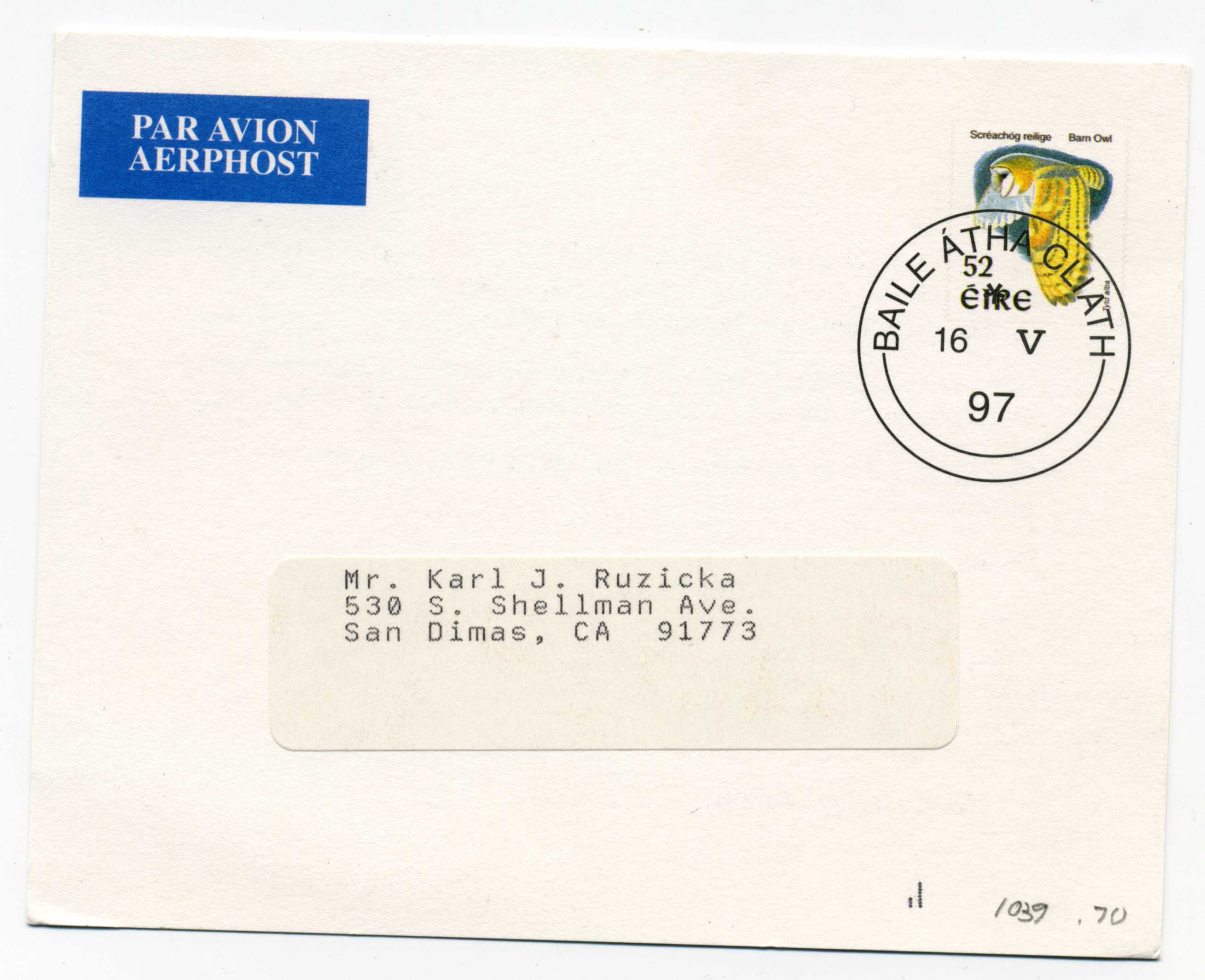 PH121 Image | 1997 Postcard bearing printed 52p Barn Owl tied by Baile Atha Cliath cds sent out by An Post advising clients of their attendance at Pacific 97