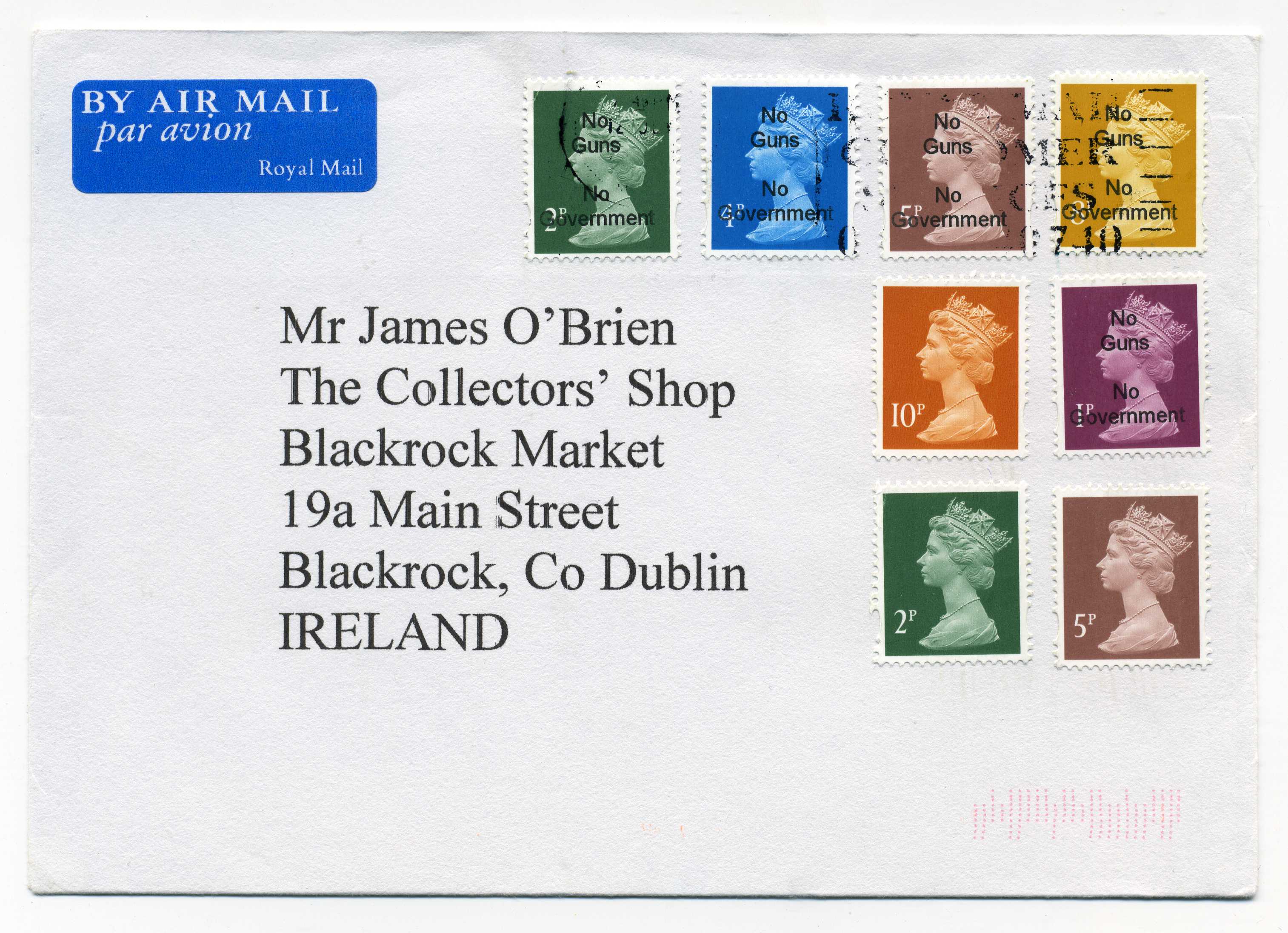 PH122 Image | 2001 GB 1p, 2p, 4p, 5p and 6p machins all overprinted "No Guns No Government" used on cover with London machine cancel, a scarce modern propaganda cover.
